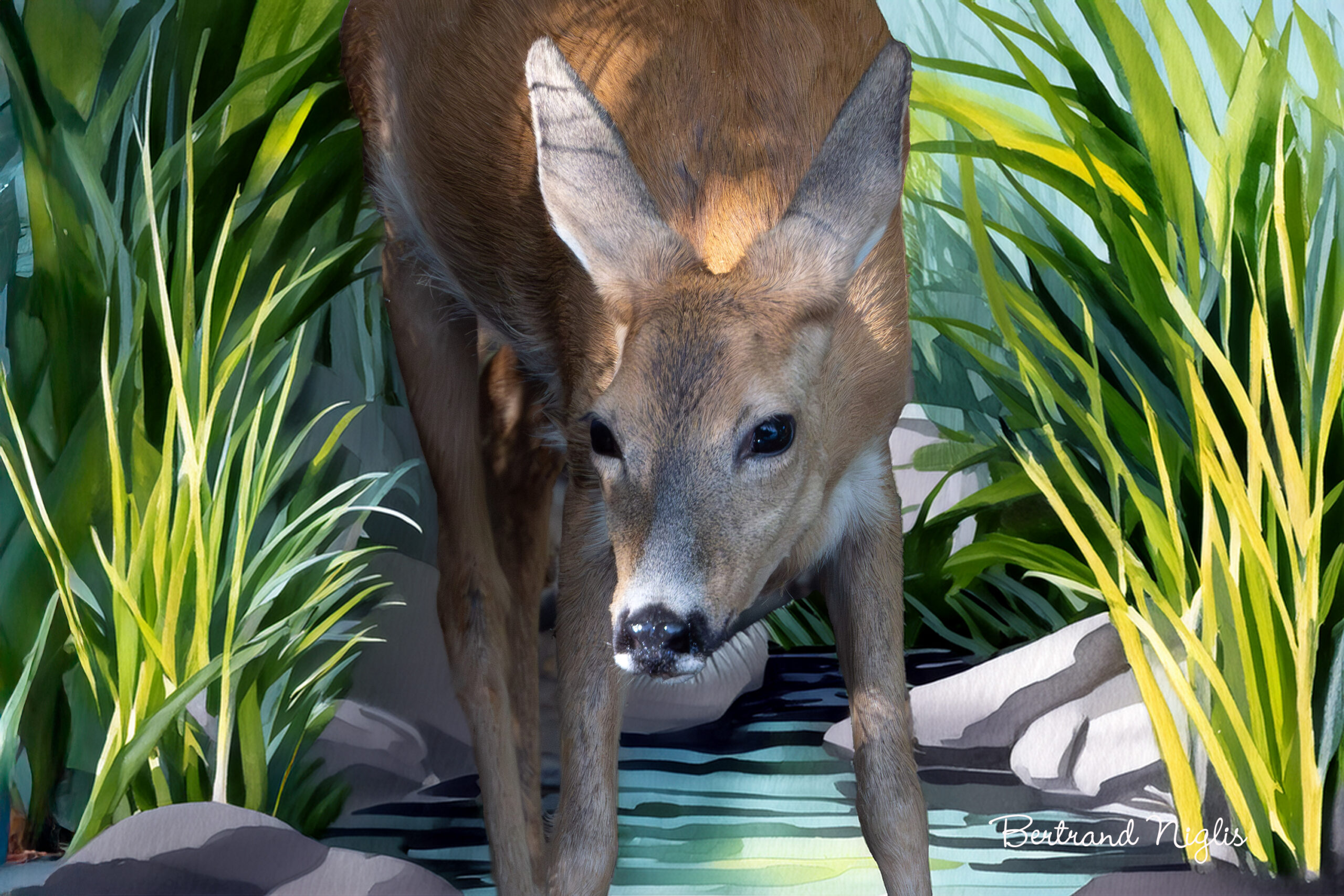 Dans la campagne chauffée à blanc par un soleil conquérant, l’accès à l’eau est une priorité pour tout être vivant. Les oiseaux retournent régulièrement à l’abreuvoir, les insectes recherchent le moindre point d’humidité, les rongeurs trouvent dans les végétaux de quoi se désaltérer. Les grands animaux sont soumis à la même loi, et si l’on a des chances de les croiser, c’est précisément au bord des rivières et près des sources. Les points de passage sont  souvent marqués, et il suffit d’être présent au bon moment pour les apercevoir. La discrétion est cependant de mise, car même assoiffés, ils restent vigilants, prêts à faire demi-tour pour ne pas s’exposer à la vue des curieux. Ce sont d’ailleurs souvent les oiseaux qui leur ouvrent la voie : quand ils boivent en toute quiétude, cela signifie que la voie est libre. C’est à l’extrémité du plan d’eau, que ce chevreuil s’est frayé un chemin au milieu des herbes hautes pour étancher sa soif et s’offrir une petite trempette.