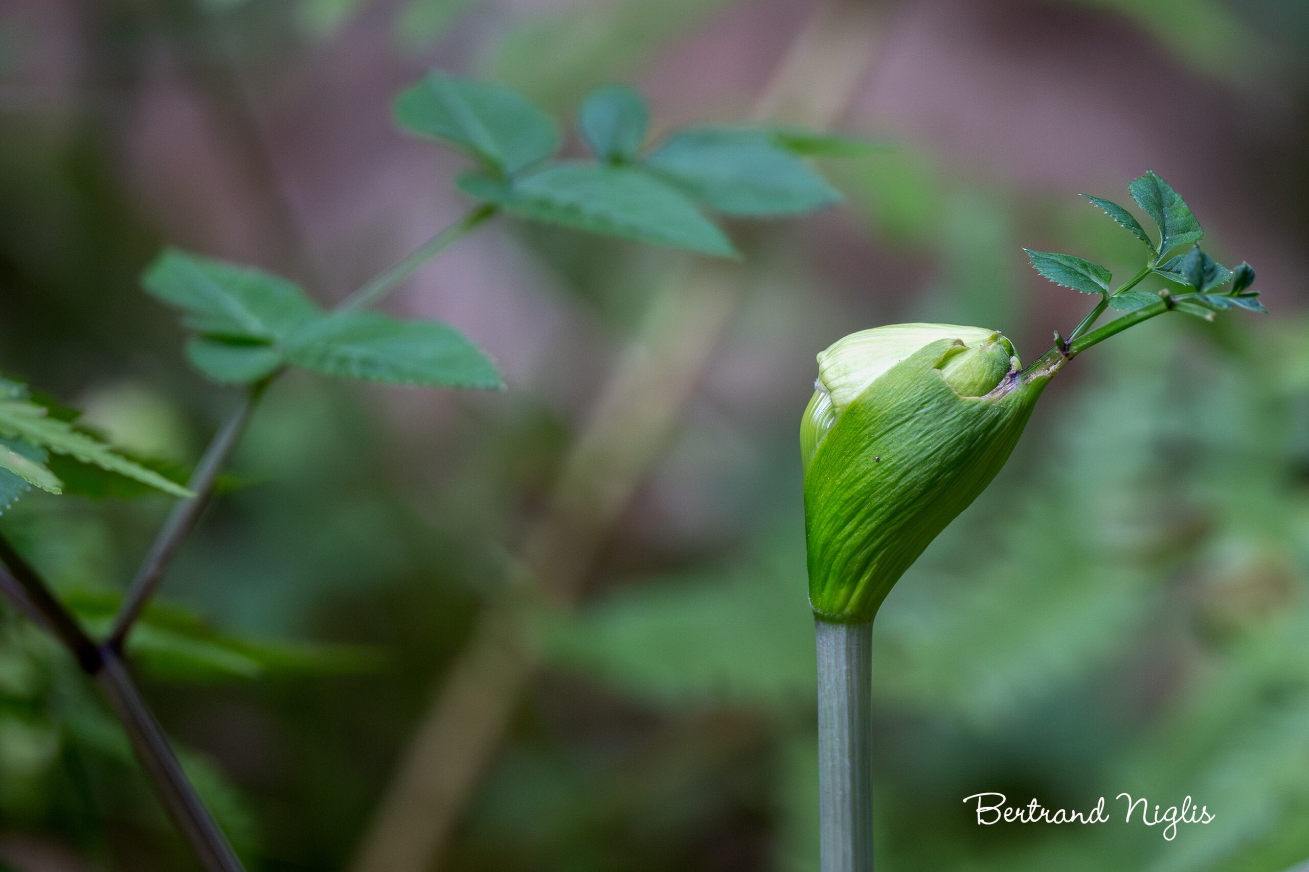 Au moment où d’autres plantes montent déjà en graines, l’angélique des bois en est seulement au stade de la floraison. Cet exemplaire a mis du temps à préparer sa première ombelle, comme si elle misait sur un automne moins chaud pour assurer sa descendance. En réalité, l’angélique est une plante bisannuelle. La première année, elle se concentre sur sa croissance végétative ; elle développe une rosette de grandes feuilles à la base et un système racinaire puissant, accueillant d’importantes réserves énergétiques dans sa racine pivotante. C’est au cours de la seconde année qu’elle fait pousser une haute tige florale, très robuste. Nous assistons ici à la croissance d’une branche secondaire, le long de la branche principale qui, elle,  poursuivra son ascension.  Les ombelles composées sont typiques des apiacées, la famille de l’angélique. Le nom de la plante remonte au moyen-âge et est directement lié à son exceptionnelle réputation médicinale. Elle était considérée comme un don divin. Une légende prétend que c’est l’archange Gabriel qui aurait révélé à un moine ses propriétés curatives, en particulier sa capacité à combattre la peste.