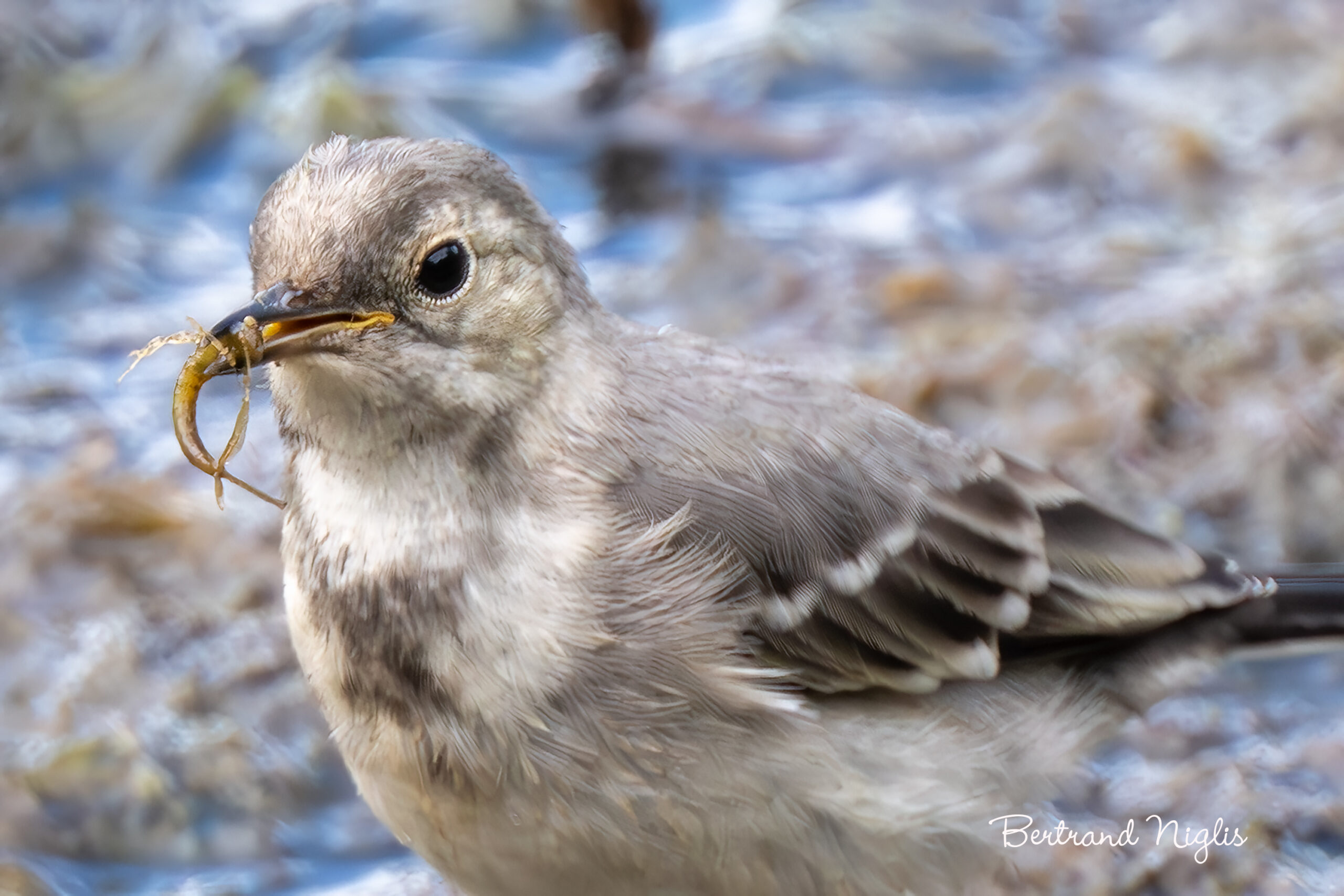 Certains oiseaux nous sont plus familiers que d’autres, mais ce n’est pas pour autant que l’on ne prend plus de plaisir à nous arrêter pour les observer. C’est le cas de la bergeronnette grise que l’on distingue très facilement à son vol onduleux et ses couleurs de sénior. Parfois, on hésite cependant, surtout lorsqu’il s’agit de juvéniles, ou lorsque l’oiseau a déjà effectué sa mue post-nuptiale. Le jeune qui court sur la vase du marais a déjà acquis une grande expérience. Il vient de saisir une larve aquatique déboussolée par la soudaine baisse de l’eau protectrice. Pour la bergeronnette, elle constitue un met de choix et un apport significatif de protéines. Elle se laisse d’ailleurs volontiers photographier, comme le font les pêcheurs, fiers de leur prise. Mais la pause ne dure qu’un bref instant : la dégustation achevée, elle n’a d’autre envie que d’en débusquer beaucoup d’autres.