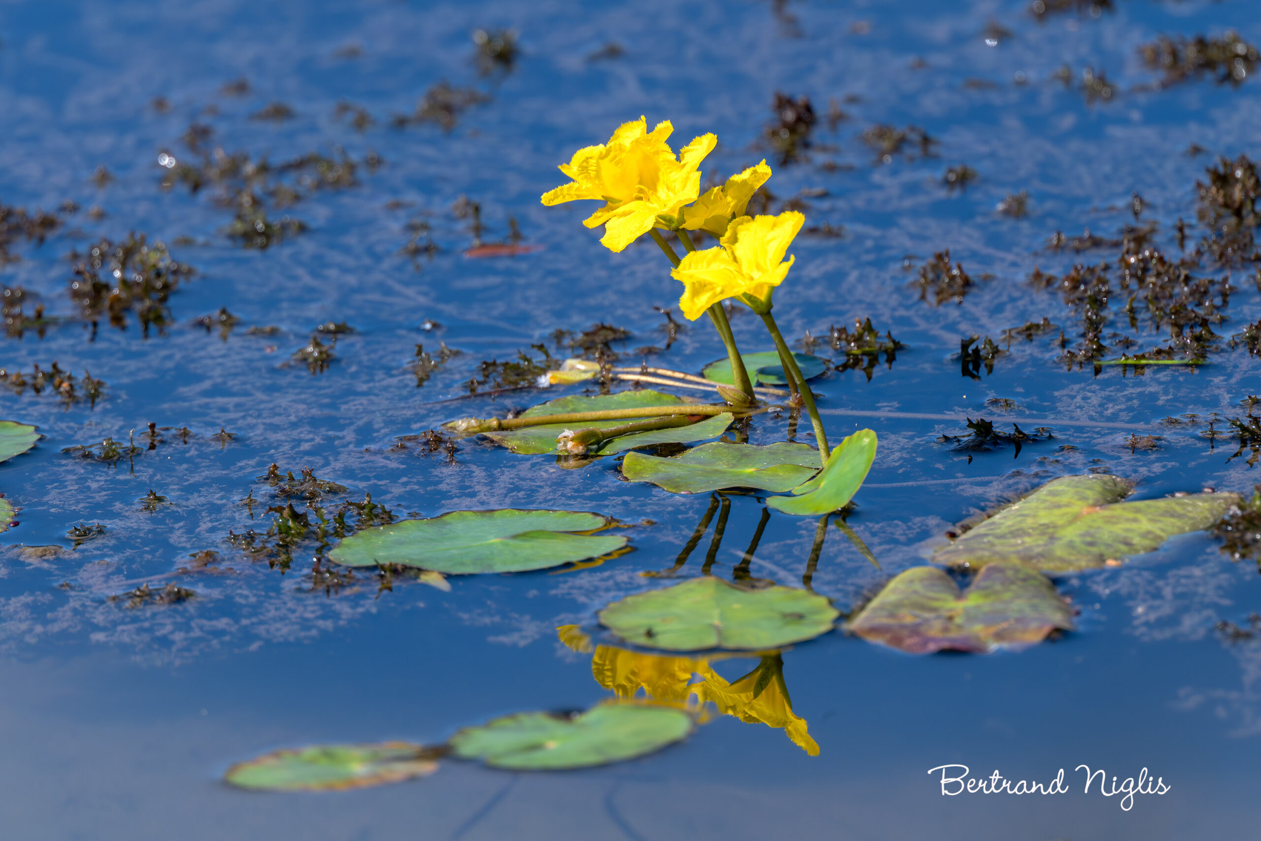 Dans les marais de la Petite Camargue Alsacienne, on peut admirer le nénuphar pelté (Nymphoides peltata), une plante dont le nom est particulièrement évocateur. Le terme nénuphar vient de l’arabe nînûfar, et désigne les plantes aquatiques à feuilles flottantes. Ses feuilles rondes rappellent celles du genre Nymphaea (les vrais nénuphars), mais il appartient à un genre botanique différent, ce qui lui vaut également d’être appelé « faux nénuphar ». L’adjectif pelté, quant à lui, vient du latin peltata qui signifie « en forme de bouclier », en référence à la manière dont le pétiole s’attache au centre de la feuille. Le cycle de vie de cette plante est directement lié aux saisons. Vivace, elle entre en dormance l’hiver sous la forme de rhizomes pour réapparaître au printemps. Ses fleurs jaunes sont remarquables par leurs bords finement découpés en franges délicates et denses, ce qui leur donne un aspect duveteux. Elles s’ouvrent le matin et se referment le soir, chaque fleur individuelle durant plusieurs jours et apportant une touche lumineuse aux plans d’eau durant les mois chauds. En plus de sa beauté, cette plante crée un véritable micro-écosystème qui est vital pour la biodiversité du marais, servant de lieu de vie, de reproduction et de survie pour de nombreuses espèces telles que les insectes, les batraciens, les poissons et les oiseaux.