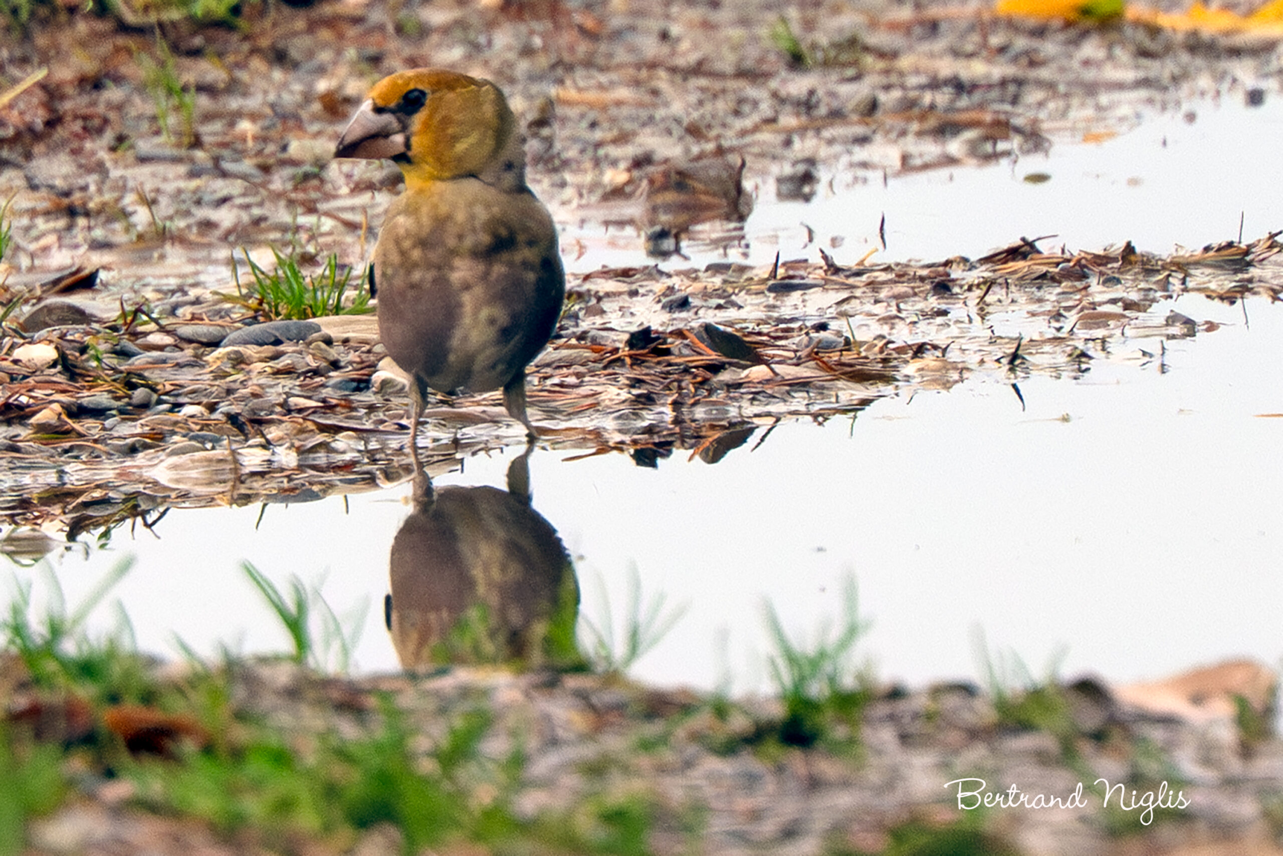 En été, lorsque la végétation est dense, il est plus difficile d’observer les oiseaux que durant la saison froide. Mais avec un peu de patience, on peut faire de belles rencontres près des points d’eau. C’est sur un chemin de campagne, partiellement inondé par les pluies de la nuit que le gros-bec s’est posé pour s’abreuver. L’oiseau semble être une femelle en raison de son plumage plus discret et plus uniforme, sans les couleurs vives du mâle. La tête est d’un jaune-brun assez uni, et le corps présente des tons plus doux et moins contrastés. Cependant, c’est son bec qui reste le signe distinctif le plus évident chez les deux sexes. Cet attribut unique lui confère un avantage considérable pour sa survie, particulièrement durant la saison hivernale. Contrairement à de nombreux oiseaux qui migrent vers le sud, le gros-bec a tendance à rester sur son territoire. Son bec puissant lui permet alors de se nourrir de graines et de noyaux durs, une source d’énergie que peu d’autres espèces peuvent exploiter.