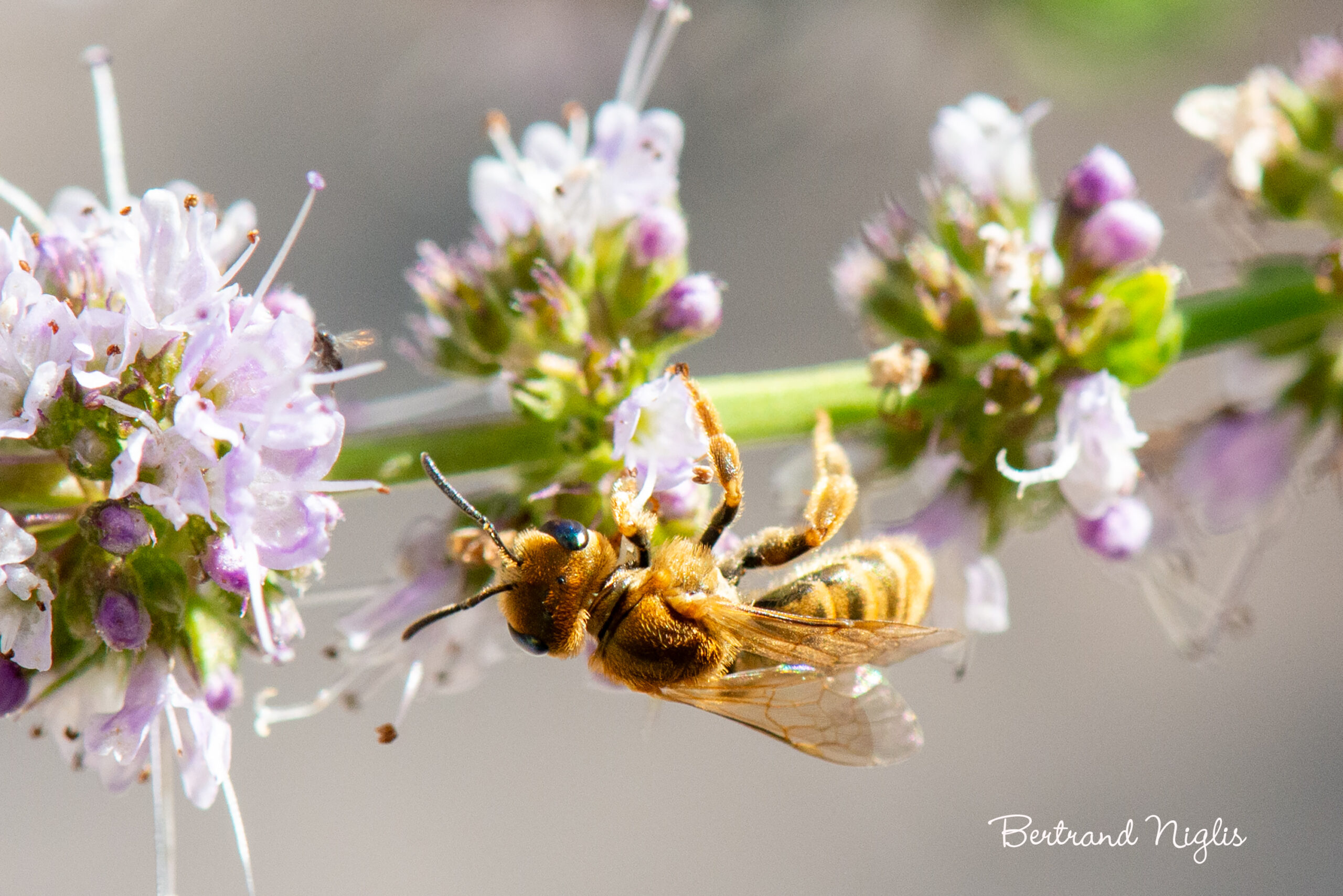 L’halicte de la scabieuse, une espèce d’abeille de la famille des Halictidae, se distingue par son corps brun-roux et ses bandes abdominales claires. Elle est de taille moyenne, mesurant environ 10 à 12 millimètres, et son corps est couvert d’une pubescence (poils fins) qui lui donne un aspect duveteux. Son nom scientifique, Halictus scabiosae, fait référence à son affinité pour les fleurs de la scabieuse, bien qu’on puisse la voir butiner une grande variété de plantes comme la menthe, l’origan ou le thym, à la recherche de nectar et de pollen pour nourrir ses larves. On la rencontre principalement dans des habitats ouverts, tels que les prairies, les bords de chemins et les jardins. Le cycle de vie de cette abeille est solitaire, mais elle a une organisation sociale rudimentaire. Au printemps, les femelles fécondées de l’année précédente sortent de leur hibernation souterraine. Chaque femelle creuse un terrier dans le sol pour y construire un nid. Ce nid est composé de cellules individuelles, chacune étant approvisionnée en une boule de pollen et de nectar sur laquelle un œuf est pondu. Les larves qui en éclosent se nourrissent de cette réserve, se développent et se nymphosent pour donner une nouvelle génération d’adultes à la fin de l’été. La nouvelle génération se compose de mâles et de femelles. Après l’accouplement, les mâles meurent, et les femelles fécondées cherchent un abri souterrain pour passer l’hiver et répéter le cycle au printemps suivant. Contrairement aux abeilles domestiques, elle ne forme pas de grandes colonies permanentes, mais sa stratégie de vie, bien que solitaire, lui permet de prospérer dans son écosystème.