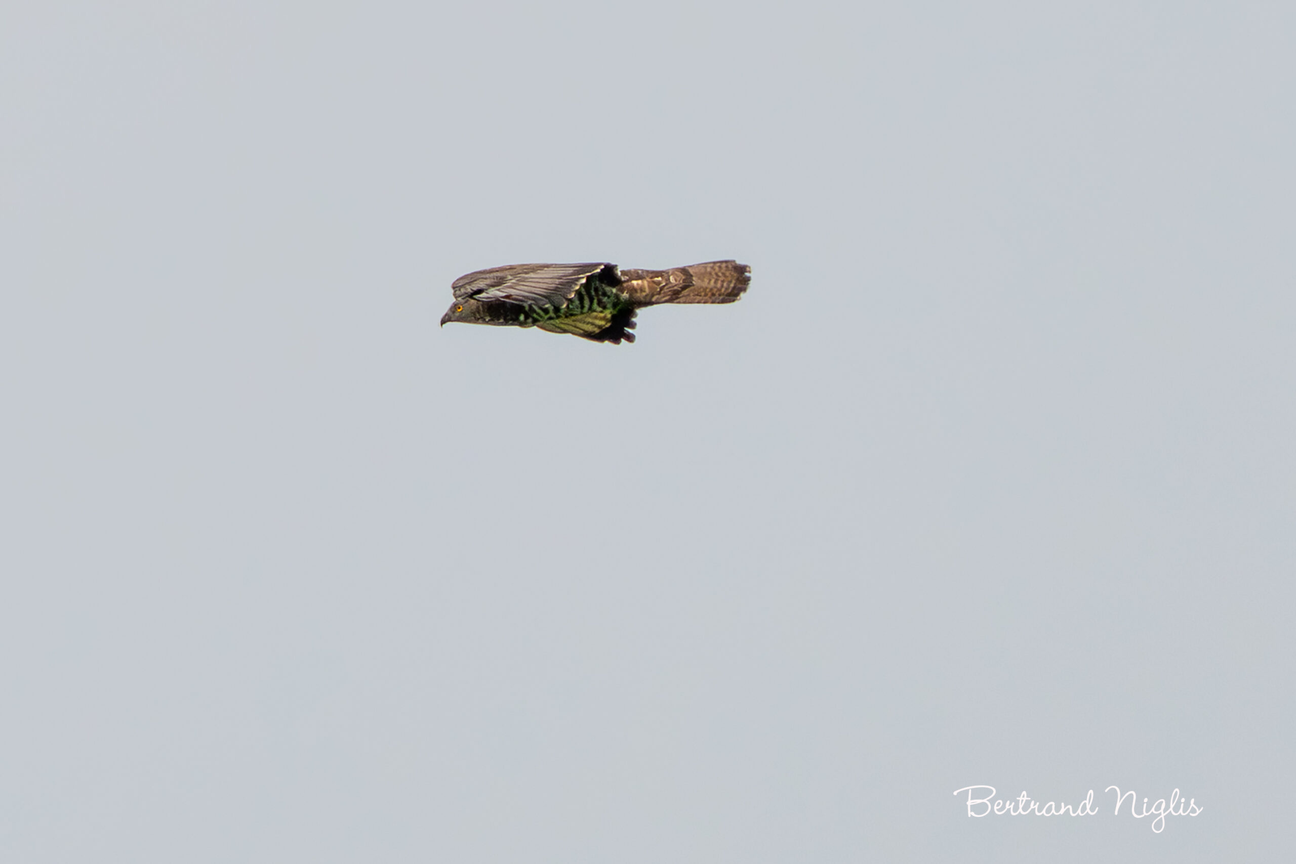 Dans le ciel du Rothmoos, plane un rapace que l’on observe rarement. Il arrive dans notre région au printemps et repart dès la fin de l’été. Ses ailes sont larges et la queue relativement longue est barrée tout comme le dessous des ailes. La tête est proportionnellement petite par rapport à la silhouette en vol. C’est une bondrée apivore. L’origine du nom est assez énigmatique : il pourrait venir du breton « bondrask » qui signifiant « grive ». L’adjectif apivore illustre son régime alimentaire : contrairement au milan ou balbuzard pêcheur, la bondrée se nourrit presque exclusivement des larves et des nymphes de guêpes, frelons et bourdons. Pour se protéger des piqûres pendant qu’elle déterre les nids, elle possède des adaptations remarquables. Autour du bec et des yeux, ses plumes sont courtes, raides et serrées, formant une sorte de bouclier qui empêche les insectes de la piquer à la tête. Ses narines sont étroites et en forme de fente, ce qui évite que la terre, la cire ou les insectes n’y pénètrent. Ses pattes et ses doigts sont recouverts d’épaisses écailles, offrant une protection supplémentaire contre les piqûres lorsqu’elle déterre les nids. Ses serres sont également moins courbées que chez d’autres rapaces, ce qui facilite le creusement.