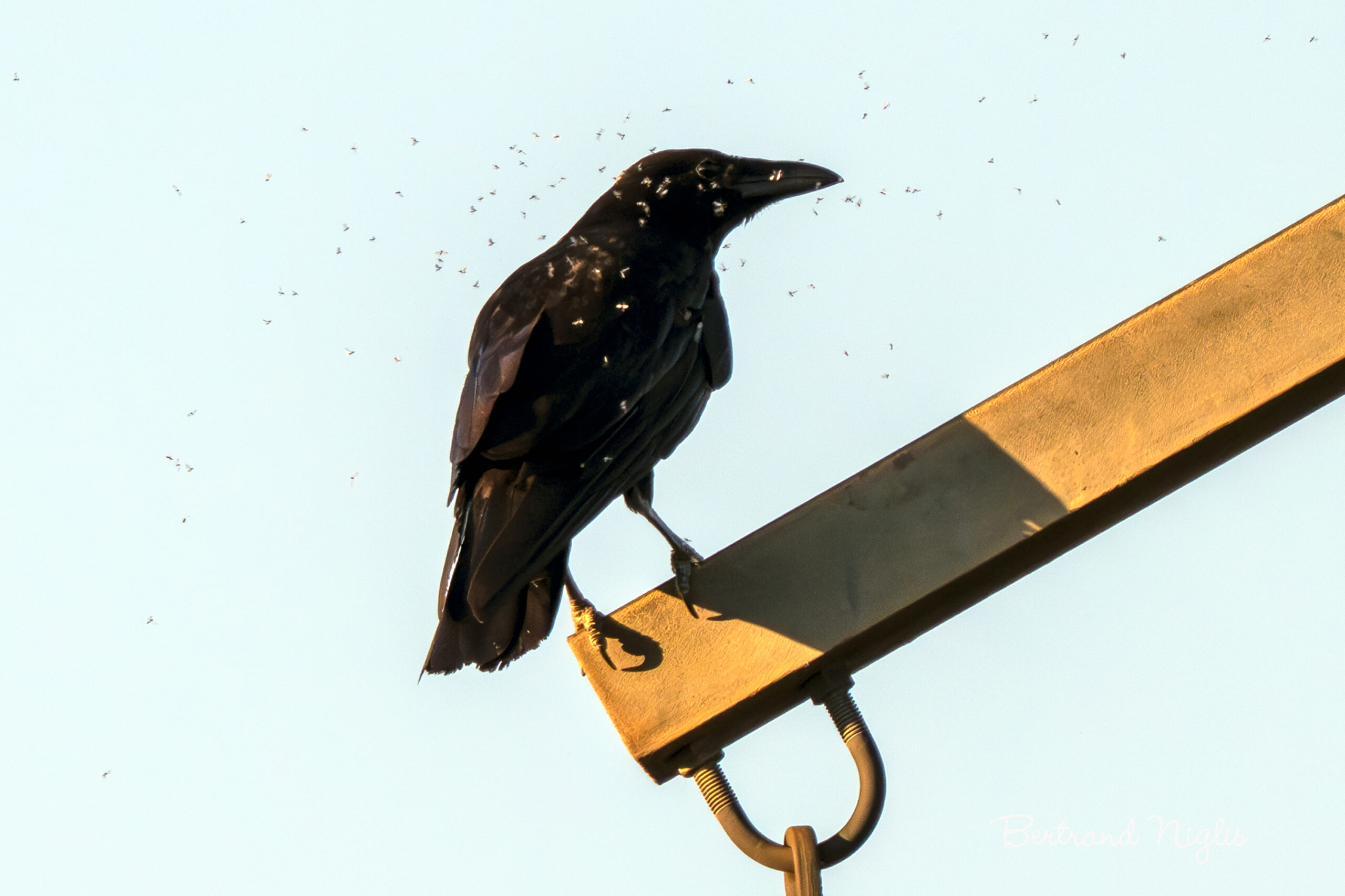 C’est bien connu : quand on est en groupe, on se sent fort. Sans doute ces moucherons ont-ils compris qu’ils ne risquaient rien à importuner une corneille. Alors, c’est en essaim qu’ils font la fête pour célébrer à la fois le jour de leur naissance et celui de leur noce. La scène se joue en altitude, au sommet d’un pylône électrique, car il faut bien rester branché et ne pas perdre le fil des nouvelles. L’arrivée soudaine d’une escouade d’hirondelles ou de martinets serait une catastrophe collective et anéantirait tout espoir de survie. Le corvidé n’a pas été mis en scène par le fabuliste comme le héron obligé de se rabattre sur du menu fretin afin d’apaiser sa faim. Opportuniste et omnivore, la corneille n’a aucune difficulté à se nourrir. Elle ne doit cependant pas beaucoup apprécier cette cour d’insectes qui tournent autour d’elle et qui laisseraient penser qu’elle ne s’est pas lavée depuis longtemps.