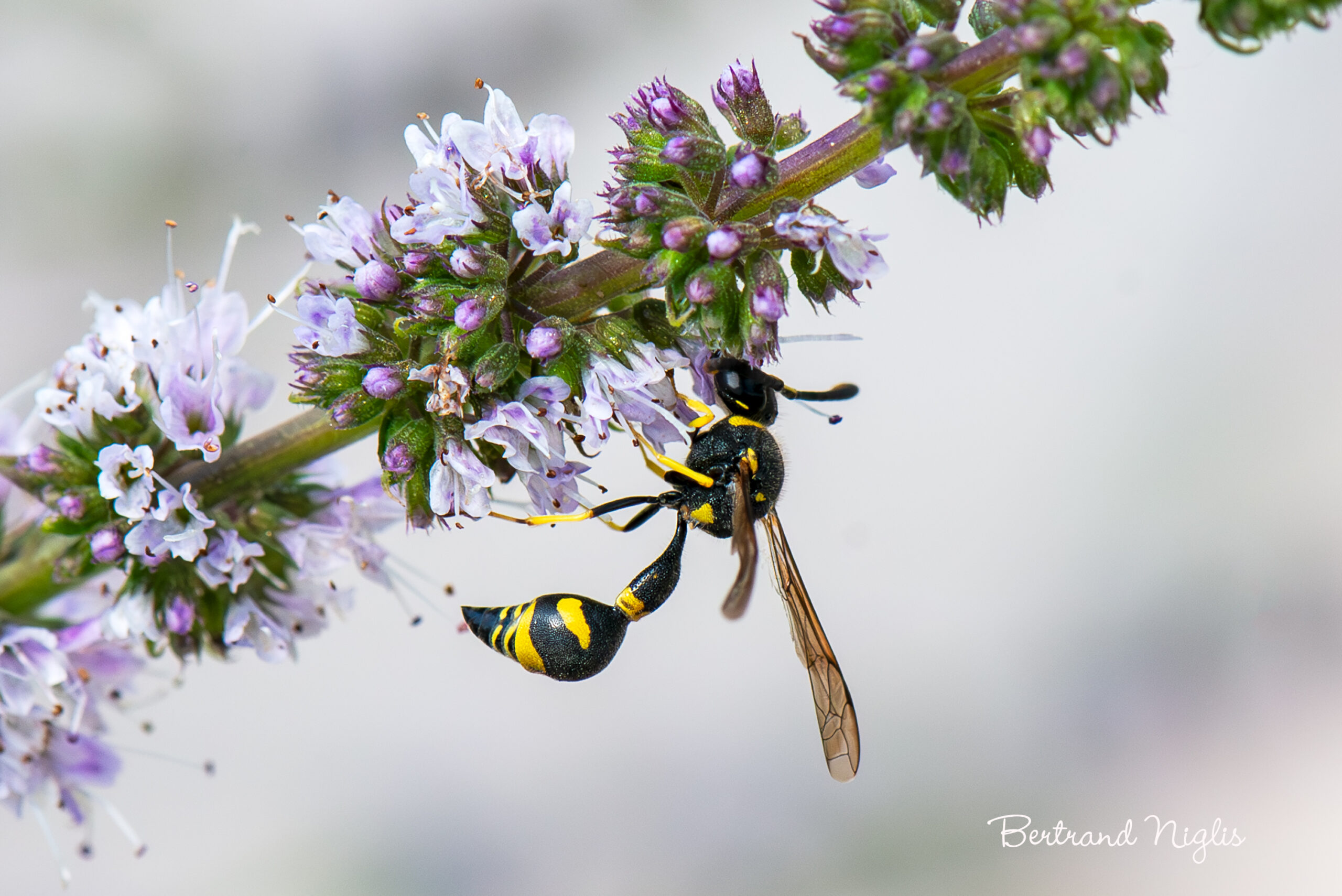 L’Eumène coarctatus, plus connue sous le nom de guêpe potière, est un hyménoptère fascinant de la famille des Vespidae. On la distingue facilement par son abdomen pédonculé, très fin à la base, et par ses marques jaunes et noires. Cet insecte solitaire se démarque de ses cousines sociales comme le frelon ou la guêpe commune. Il ne vit pas en colonie et chaque femelle construit seule son nid. Son régime alimentaire est double : l’adulte se nourrit de nectar, ce qui en fait un pollinisateur efficace, tandis que les larves sont carnivores. Son cycle de vie est directement lié à la reproduction. Après l’accouplement, la femelle construit un nid en forme de petit pot de terre, d’où son surnom. Elle y dépose ensuite un œuf et paralyse des chenilles ou des larves d’autres insectes qu’elle entrepose comme garde-manger pour sa future progéniture. La larve qui éclot se nourrit de cette réserve jusqu’à sa nymphose. Ce comportement est un exemple de parasitisme. Ce cycle permet un contrôle naturel des populations d’insectes nuisibles pour les cultures. De ce fait, l’Eumène coarctatus joue un rôle bénéfique en tant qu’auxiliaire de l’agriculture, contribuant à la biodiversité et à l’équilibre des écosystèmes.