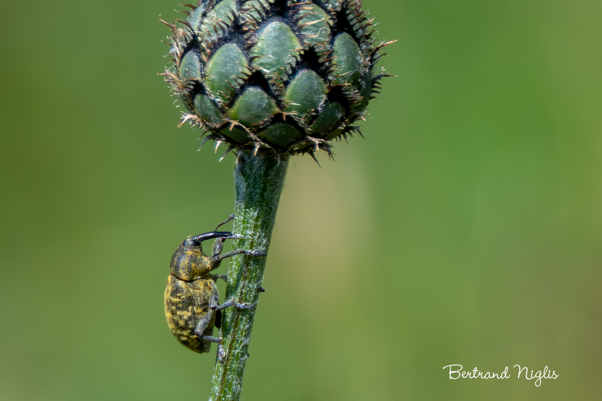 Voilà encore une petite créature, Larinus planus, qui nécessite de chausser ses lunettes pour l’observer attentivement. Pourtant le nom du genre dérive d’un mot grec qui signifie « gros » ou « épais », en allusion à la forme généralement arrondie et trapue de ces coléoptères. Il appartient à la famille des Curculionidae, communément appelés charançons. L’adulte du Larin des chardons, mesurant entre 5 et 10 mm, est reconnaissable à son corps oblong, de couleur foncée (brunâtre à noir) avec des taches de poils clairs et un rostre long et incurvé. C’est un insecte très spécialisé, dont les larves se développent exclusivement à l’intérieur des capitules floraux des chardons, notamment le chardon des champs. La femelle pond un œuf unique dans chaque bouton floral, et la larve qui en résulte se nourrit du contenu du capitule, détruisant ainsi la quasi-totalité des graines. Pour cette raison, il a été introduit dans certaines régions, notamment en Amérique du Nord, comme agent de lutte biologique contre les chardons considérés comme des plantes invasives.