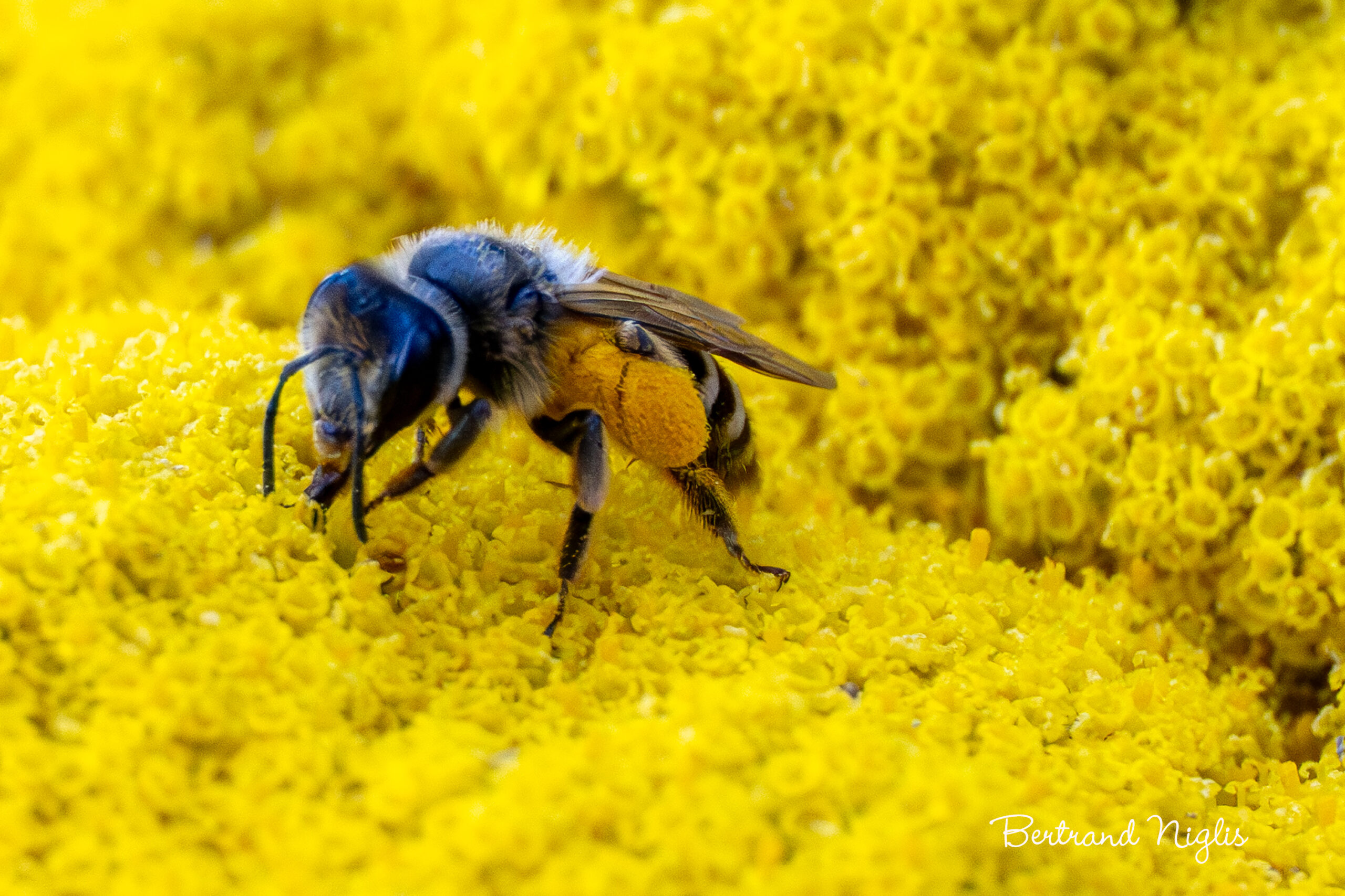 « Regarde ! Là, sur la tanaisie, un insecte est en train de butiner. Une invitation à l’observation qui engendre souvent une question-piège, du type : « Qu’est-ce que c’est comme insecte? » Car l’identification précise de l’espèce peut être difficile. Essayons donc de relever des détails intéressants. Le thorax est densément couvert de poils gris clair à blanc. L’abdomen est plus sombre, avec des bandes fines, claires et régulières sur le bord des segments. Intéressons-nous maintenant à la pilosité des pattes : elle est dense. Par ailleurs, les corbicules (les paniers à pollen) sur les pattes arrière sont très développés et remplis de pollen jaune vif. Il s’agit donc d’une femelle. Sur la tête, les mandibules sont bien visibles, longues et de couleur sombre. Les yeux sont grands et noirs. L’insecte a une allure robuste, typique d’une abeille de la famille des Halictidae, à laquelle appartient le genre Lasioglossum. Il en existe plus de 100 espèces différentes rien qu’en France. Pour aller plus loin, il faudrait recourir au microscope. Ne soyons pas frustrés : les spectacle est somptueux, profitons-en.