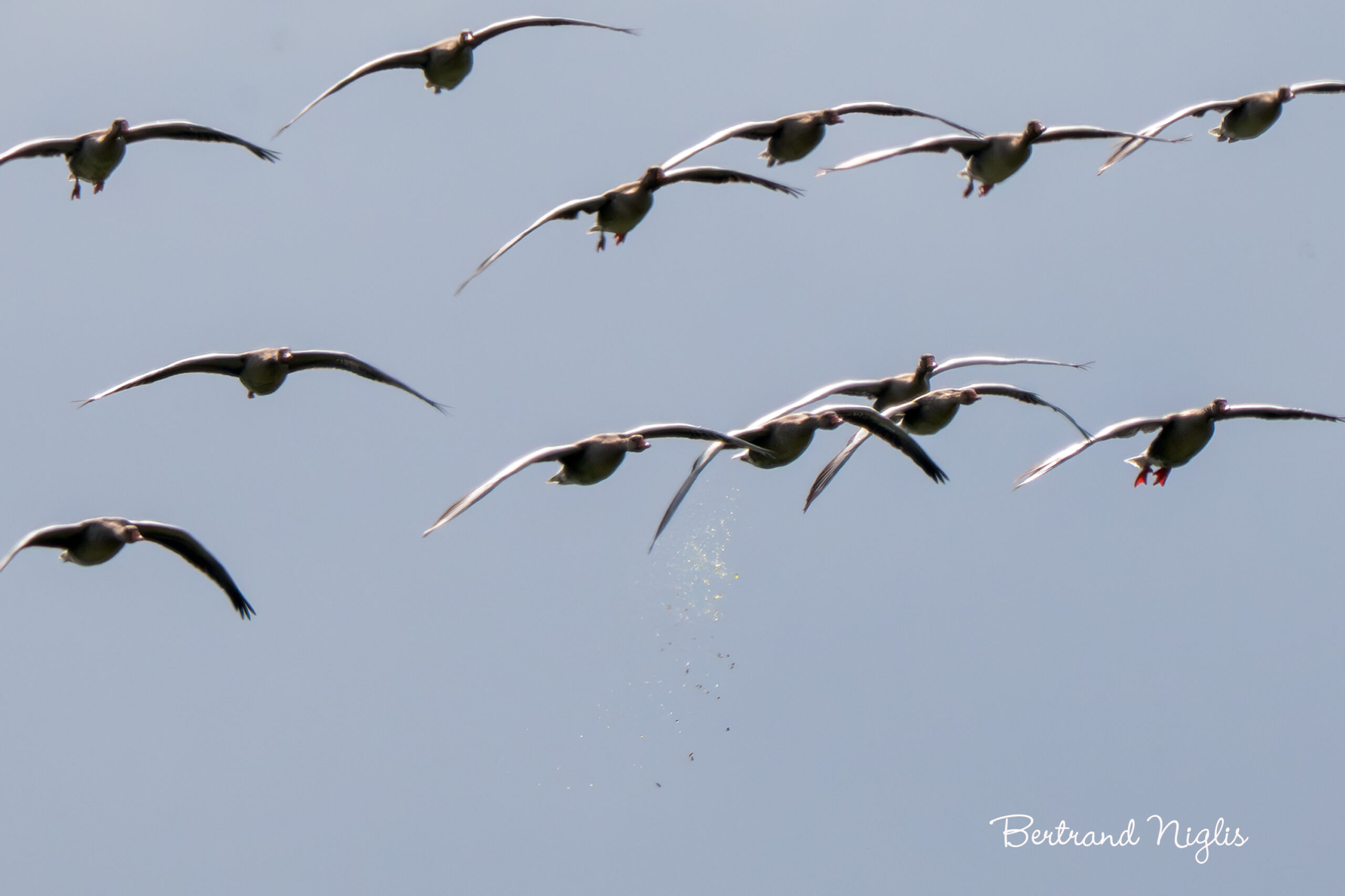 Les pilotes savent qu’il faut parfois larguer du carburant pour alléger un avion avant un atterrissage d’urgence. Par un surprenant parallélisme visuel, la photo de ces oies cendrées en approche du marais semble montrer un phénomène similaire. Cependant, les apparences sont trompeuses. Ce que l’on voit sur la photo est en réalité un processus d’excrétion tout à fait naturel. Le jet de déjections est un mélange de fientes (la partie sombre, issue de la digestion) et de cristaux d’acide urique (la partie blanche). Les oies, comme les autres oiseaux, ne produisent pas d’urine liquide et n’ont pas de vessie. Leur métabolisme, très rapide, leur permet d’extraire l’eau de leurs aliments pour la conserver, ce qui est vital pour le vol. Leurs reins filtrent les déchets pour former l’acide urique, une substance semi-solide, qui est ensuite stockée et expulsée par le cloaque, une ouverture unique. Les oies sont principalement herbivores, et leur alimentation riche en protéines végétales génère d’importantes quantités d’acide urique. Le volume des cristaux peut surprendre mais il est le reflet d’un métabolisme intense, typique d’un oiseau sain après un effort de vol important. La nature a ses propres solutions pour gérer les déchets, et elles sont bien plus efficaces qu’un simple largage de carburant.