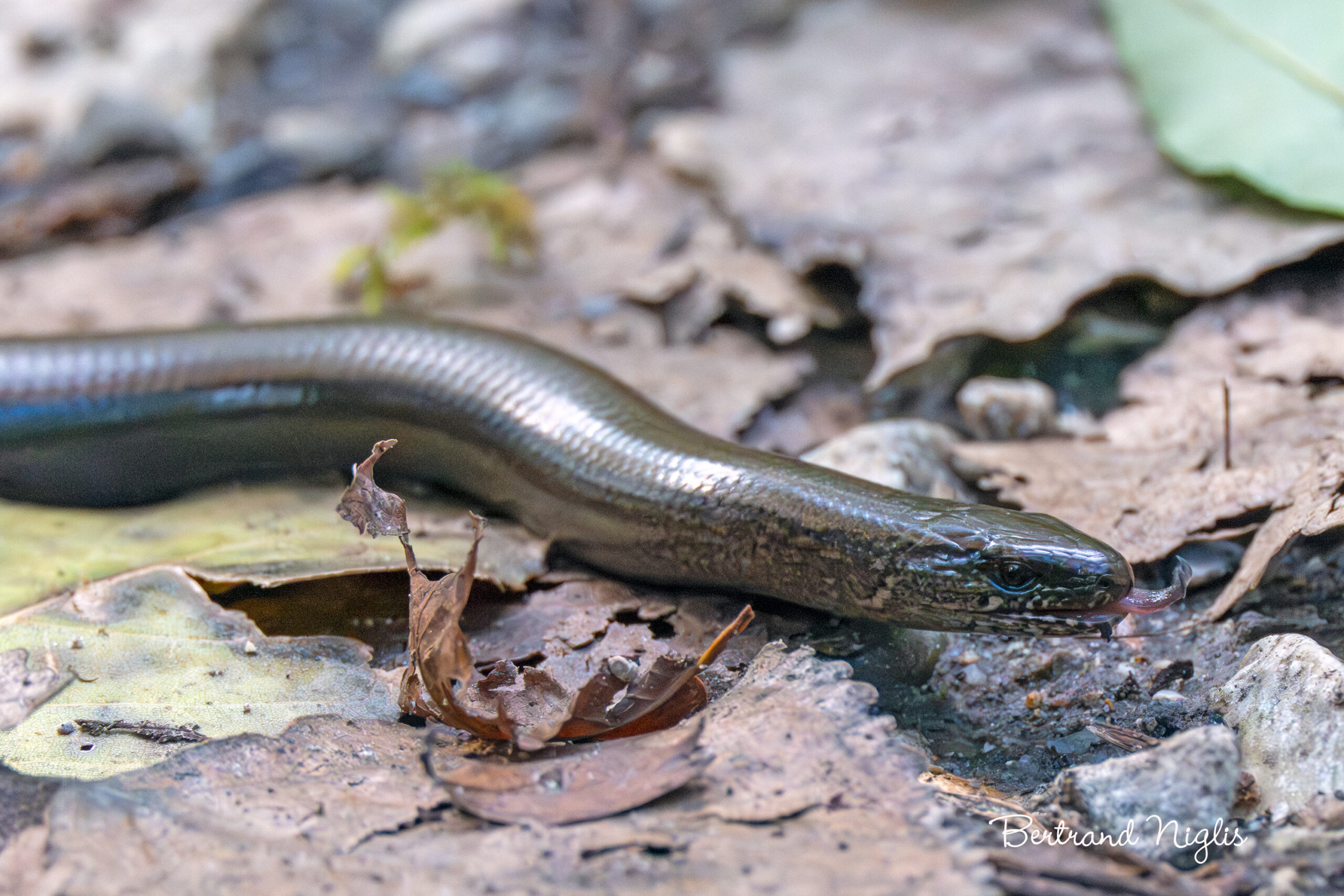 Cet orvet fragile a été croisé sur un sentier de sous-bois ombragé. Il avançait prudemment en interprétant les signaux olfactifs captés par sa langue. Il s’agit vraisemblablement d’un mâle. Le corps présente une coloration uniforme, sans la fine ligne dorsale sombre qui est caractéristique des femelles… La reproduction de l’orvet fragile est fascinante et constitue une caractéristique importante pour le différencier d’autres reptiles. La saison des amours a lieu au printemps, généralement entre avril et juin, après la sortie de l’hivernation. À cette période, les mâles peuvent se montrer particulièrement agressifs entre eux et se livrent à des combats. Pour s’accoupler, le mâle maintient la femelle en la mordant au niveau du cou ou de la tête. L’orvet est une espèce ovovivipare. Cela signifie que, contrairement à de nombreux reptiles qui pondent des œufs, la femelle garde les siens à l’intérieur de son corps jusqu’à ce qu’ils éclosent. La gestation dure de 3 à 5 mois. La mise bas a lieu entre juillet et septembre, et la femelle donne naissance à une portée de 5 à 20 jeunes. Les bébés orvets sont entourés d’une fine membrane transparente, qu’ils percent immédiatement après la naissance pour se libérer. Ils sont alors de petites répliques des adultes, entièrement autonomes. Le cycle reproductif des femelles est souvent bisannuel, ce qui signifie qu’elles ne se reproduisent que tous les deux ans. Cette particularité est liée à leur métabolisme et à la nécessité de reconstituer leurs réserves d’énergie après une gestation.