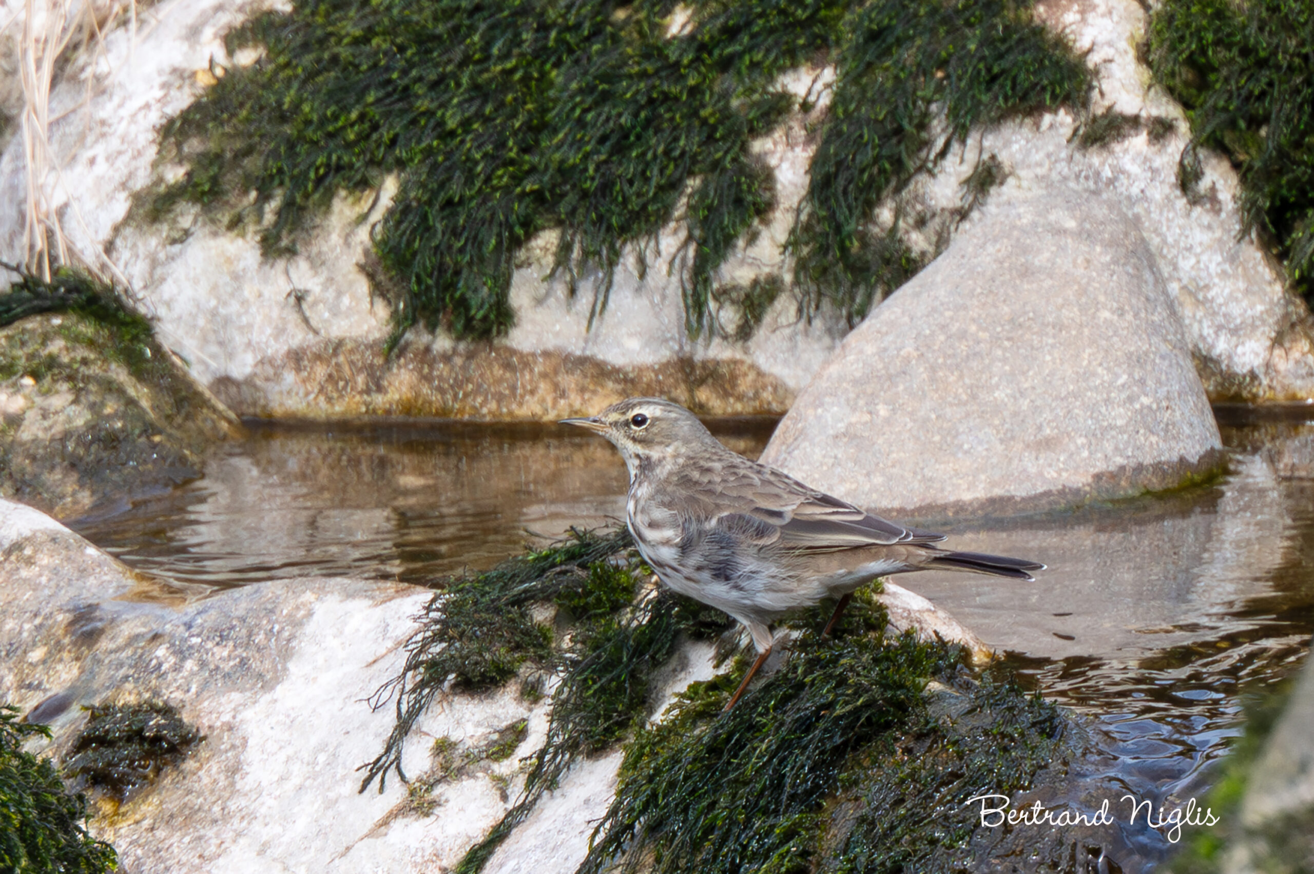 Le pipit doit son nom aux vocalises sonores souvent répétées à l’envol. On a rajouté spioncelle, qui correspond au nom que porte l’oiseau en italien. C’est l’exemple typique du transhumant qui vit l’été à la montagne, jusqu’à 2500 m d’altitude, et qui descend passer la mauvaise saison en plaine, au bord des lacs, des rivières et des fleuves. En plumage nuptial, il a le dos brun, la tête grise, les sourcils blancs, la poitrine rosée à peine rayée sur les flancs et les pattes brunes. En plumage internuptial, poitrine et flancs sont rayés de brun, les pattes sont rose brunâtre et la tête devient brune. Surtout insectivore, il se nourrit de coléoptères, mouches, sauterelles et araignées, mais également , comme ici, de petits crustacés, vers et mollusques qu’il trouve sur les rochers couverts de mousses et d’algues au bord du vieux Rhin. Le pipit spioncelle agite constamment la queue de haut en bas quand il est actif et même à l’arrêt lorsqu’il scrute son environnement. Oiseau méfiant, il s’envole lorsqu’on s’approche et va se poser un peu plus loin.