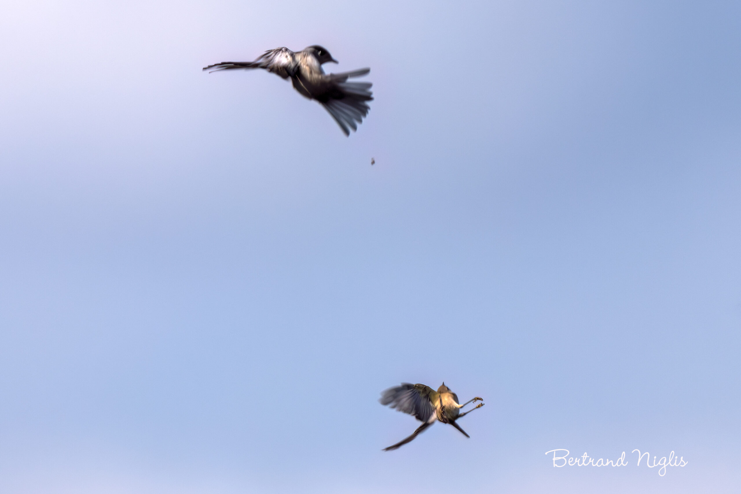 En cette journée ensoleillée de septembre qui a succédé à un passage pluvieux, les insectes sont à la fête et cela n’a pas échappé aux passereaux du secteur. Un gobemouche noir et un pouillot véloce ne cessent de s’envoler pour intercepter des proies de passage. Voici justement le moment où les deux individus réalisent qu’ils convoitent le même insecte. Pour ces passereaux, notamment en période de migration, chaque calorie compte, transformant cette simple chasse en une course effrénée et compétitive. Le gobemouche noir, plus grand, plonge avec une détermination visible, le corps aligné pour l’interception. Il compte sur sa rapidité et son inertie pour s’assurer la prise. Juste en dessous, le pouillot véloce exécute une spectaculaire pirouette, son corps basculé dans un angle étonnant. Cette manœuvre est le reflet de son immense agilité, compensant sa taille plus modeste. La confrontation est silencieuse, faite de mouvements instinctifs et d’une coordination visuelle parfaite. C’est une joute de haute voltige où l’un tente de dérober la proie tandis que l’autre cherche à devancer son rival par une trajectoire imprévisible. Les scènes d’oiseaux qui chassent ne manquent pas de piquant. Mais quand deux individus poursuivent une même proie, cela devient même prodigieux.