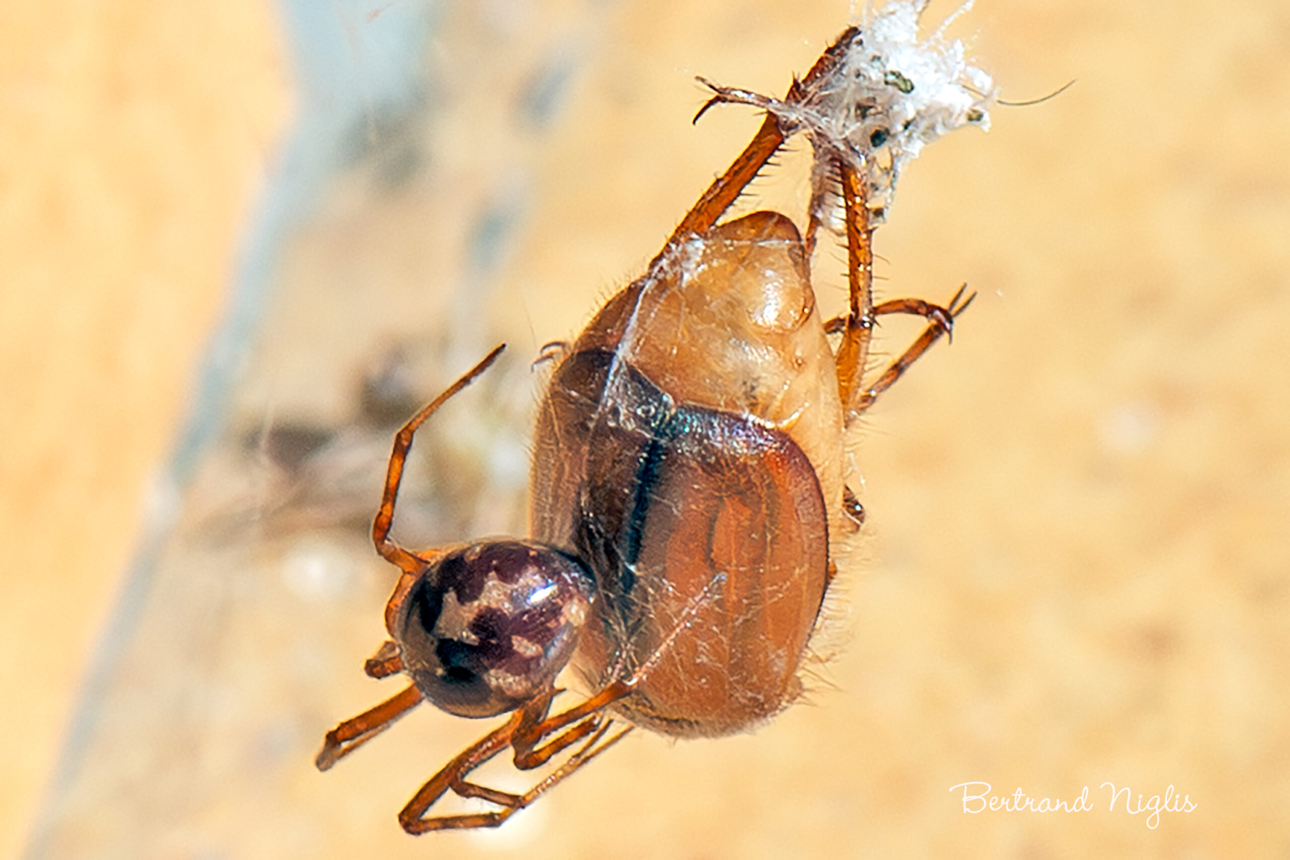 Elle a élu domicile dans la véranda, tout près de la porte d’entrée. Il faut dire que cette pièce est souvent entrouverte en été et que les visiteurs ailés y sont nombreux. Par sécurité et pour plus de confort, l’araignée a choisi un endroit discret, au ras du sol, loin du regard des humains. C’est là qu’elle tisse sa toile, de forme irrégulière , en soie collante. Régulièrement elle vient recueillir le fruit de sa chasse. Mais le hanneton d’été qui s’est pris dans ses rets n’est pas une proie commode. Sa taille impressionnante nécessite de multiples manoeuvres de contournement, et le blindage de ses élytres n’est pas facile à percer; par malchance, ce sont les pattes arrière qui sont empêtrées dans la toile et il garde toute sa capacité de défense à l’avant du front. Steatoda grossa, la veuve des villes, espère tirer profit de ce géant qui lui assurerait certainement plusieurs repas consécutifs. Face à l’homme, cette espèce n’est absolument pas agressive; de nature craintive, elle privilégie systématiquement la fuite. La femelle a une espérance de vie qui peut aller jusqu’à six années alors que les mâles ne vivent qu’un an et demi en moyenne, ce qui explique en partie le surnom qu’on donne à cette araignée.