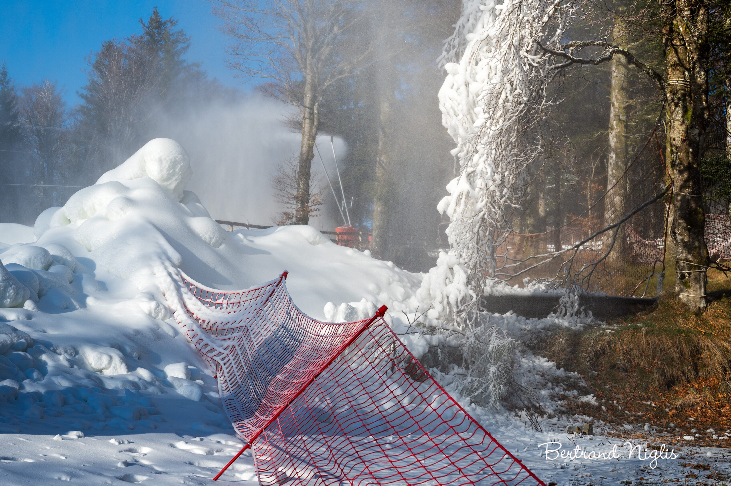 Sur cette lisière où le temps vacille, l’hiver ne tombe pas du ciel, il s’invente. À droite, la forêt s’attarde encore dans l’ambre d’un automne qui n’en finit pas. Le soleil de l’après-midi caresse l’herbe rousse et l’écorce nue, témoignant de la douceur d’un monde qui refuse de geler. Mais à quelques pas de là, la machine gronde et défie le calendrier. Sous le souffle puissant des canons, l’arbre devient une statue de cristal. Prisonnier d’une armure de givre, il ploie sous un fardeau de diamants artificiels, vivant l’hiver d’un seul côté de son tronc. Au sol, l’« or blanc » s’accumule en formes baroques, congères de glace sculptées par le vent et la buée, massifs arrondis qui semblent d’une blancheur presque irréelle face à la terre sombre. Le filet rouge, seule balafre humaine dans ce décor, délimite l’espoir : celui de voir la saison enfin blanchir. En attendant que les nuages tiennent leur promesse, l’homme façonne son propre givre, créant ce paysage singulier où deux mondes cohabitent, séparés seulement par un nuage de vapeur froide.
