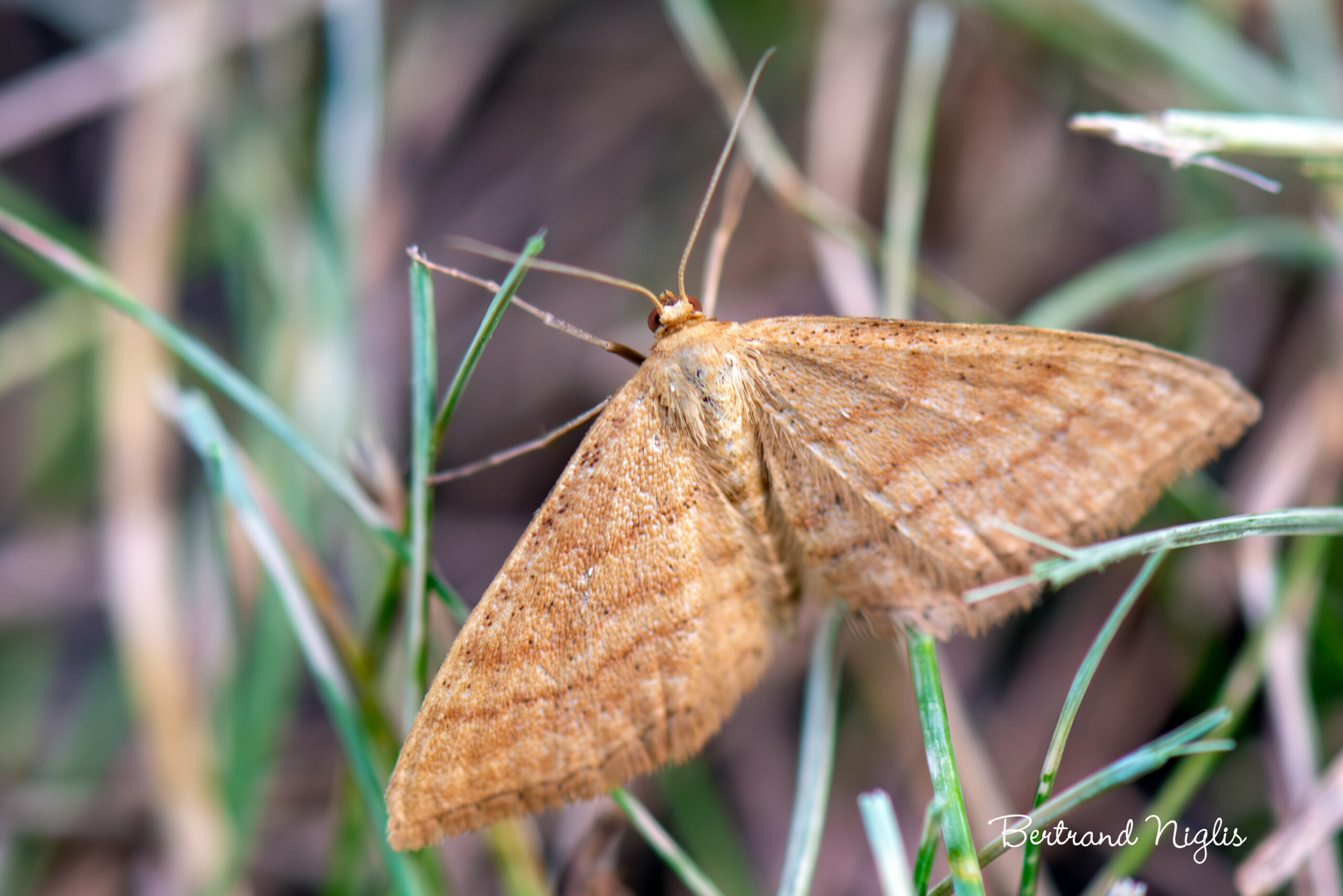 En traversant la pelouse au petit matin, il n’est pas rare de voir s’envoler des petits papillons qui se reposent aussitôt quelques mètres plus loin, sur une tige d’herbe sèche. Celui dont les ailes de couleur ocre sont traversées par des lignes plus foncées est une phalène, de la famille des géomètres. C’est une acidalie ocreuse. Acidalie est le surnom de Vénus, qui aimait se baigner dans une fontaine avec d’autres déesses. Ce papillon de nuit se singularise par une série de points noirs sur la frange des ailes. Il n’y a pas de grosse différence entre mâles et femelles. Son envergure ne dépasse pas 25mm. On le voit voler de juin à août, en une seule génération. Il fréquente les endroits bien découverts : friches, prairies, pelouses calcaires. La chenille se nourrit de préférence de feuilles de crépides, de pissenlits et de tussilages qui sont des astéracées.