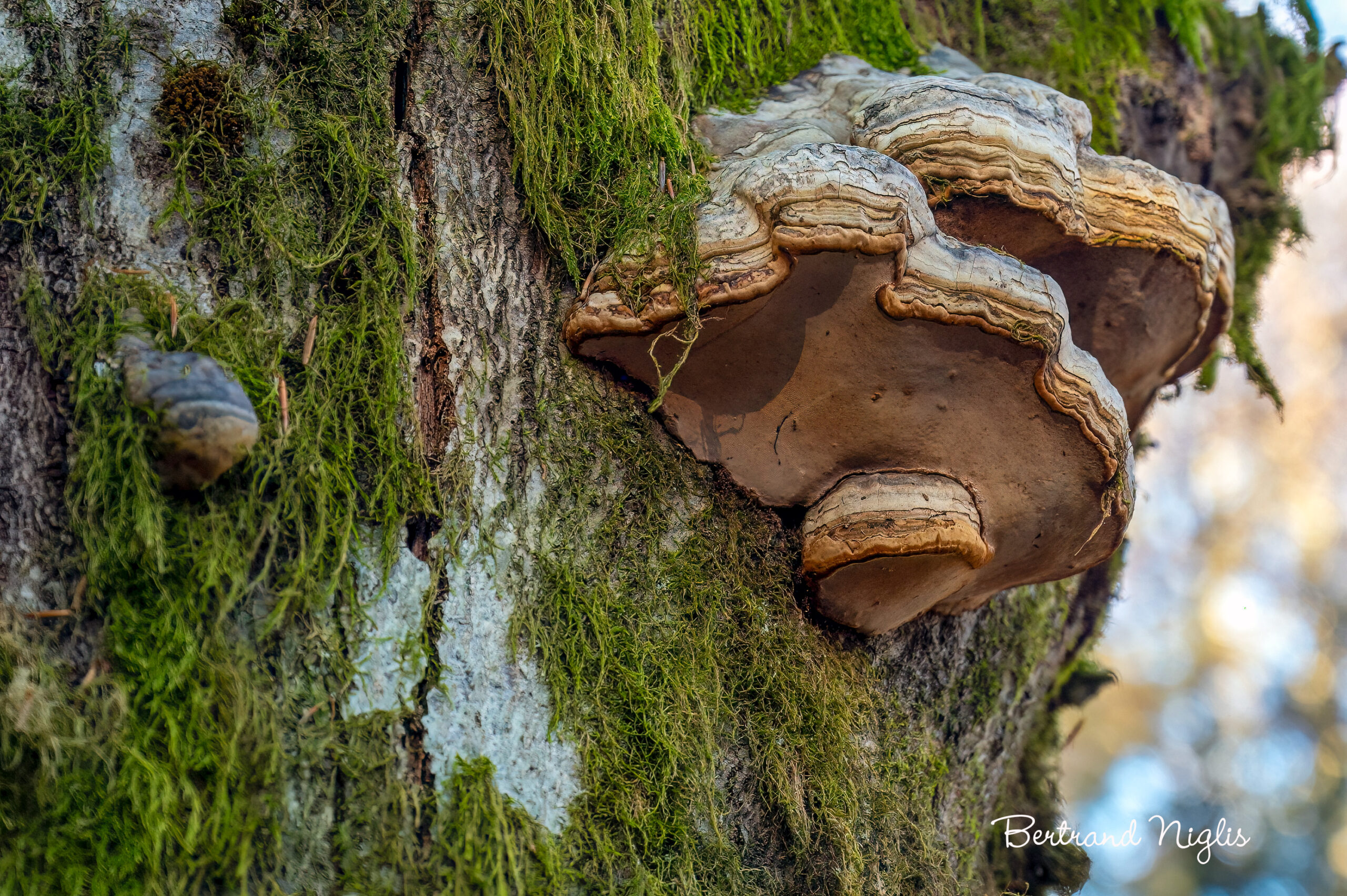 Sur le flanc rugueux d’un vieux hêtre, la vie s’expose à nu. Une luxuriante tapisserie de mousse, d’un vert intense et vibrant, étreint l’écorce comme une promesse. Elle murmure la propreté de l’air, l’humidité constante d’un sous-bois préservé, une caresse végétale qui a traversé les saisons, témoin silencieux d’une forêt à l’équilibre. Ses frondes délicates captent la lumière filtrée, signes d’une lenteur et d’une pureté que le monde moderne oublie trop souvent. Pourtant, juste à côté, le majestueux amadouvier, tel un chapiteau sculpté par le temps, raconte une autre histoire. Ses strates concentriques de gris et de brun, patiemment déposées année après année, sont les annales d’une existence qui s’achève. Il est le fossoyeur discret, le recycleur acharné, œuvrant au lent retour de l’arbre à la terre. Sa présence, loin d’être un déclin, est la promesse d’une renaissance, le banquet d’un écosystème où la mort nourrit la vie. Ici, dans cette cohabitation intime, la mousse et le champignon dressent le portrait d’une nature complexe et magnifique, un cycle éternel de décrépitude et de vitalité, inspirant jadis les bâtisseurs de cathédrales et nous invitant aujourd’hui à contempler la sagesse de la forêt.