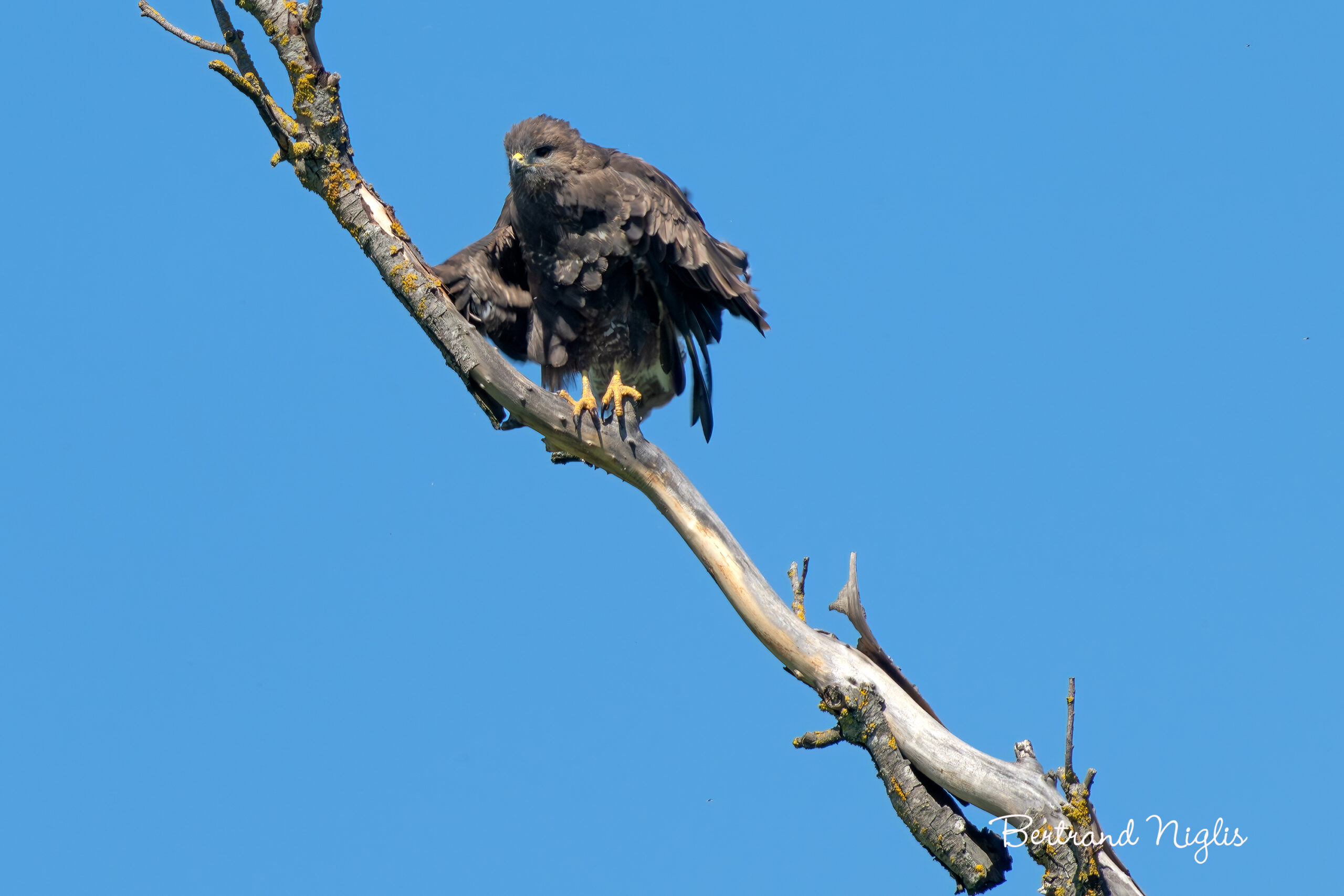 Il est fréquent d’observer la buse variable (Buteo buteo) figée au sommet d’un arbre. En dépit de sa parure que l’on dit changeante, sa silhouette trapue s’identifie aisément. L’homme ne lui porte qu’une attention distraite, le rapace, que l’on sait méfiant, n’inspirant aucune crainte. Il n’en est pas de même pour les rongeurs, pour qui la vue ou le cri de la buse est un signal de panique absolue. L’instant de l’envol, ici figé, est singulier car il capture le moment exact où le corps de l’oiseau concentre toute son énergie pour la poussée. On y retrouve ce subtil mélange de puissance et de fragilité. D’un côté, les armes du rapace, le bec crochu et les serres jaune vif, figées dans un ultime effort, brillent de tous leurs feux, symboles de la force prédatrice. De l’autre, l’armure de plumes, le plumage brun du corps et des ailes, donne des signes de relâchement et s’ouvre, trahissant la tension et la vulnérabilité du corps avant qu’il ne trouve la portance. La buse bascule, abandonnant la rigidité de la veille. Le regard, chargé de détermination, marque la volonté de s’éloigner d’un perchoir trop exposé. Elle s’élance, transformant son corps massif en une force agile, à la recherche d’un poste plus discret pour reprendre sa surveillance ou engager la chasse.