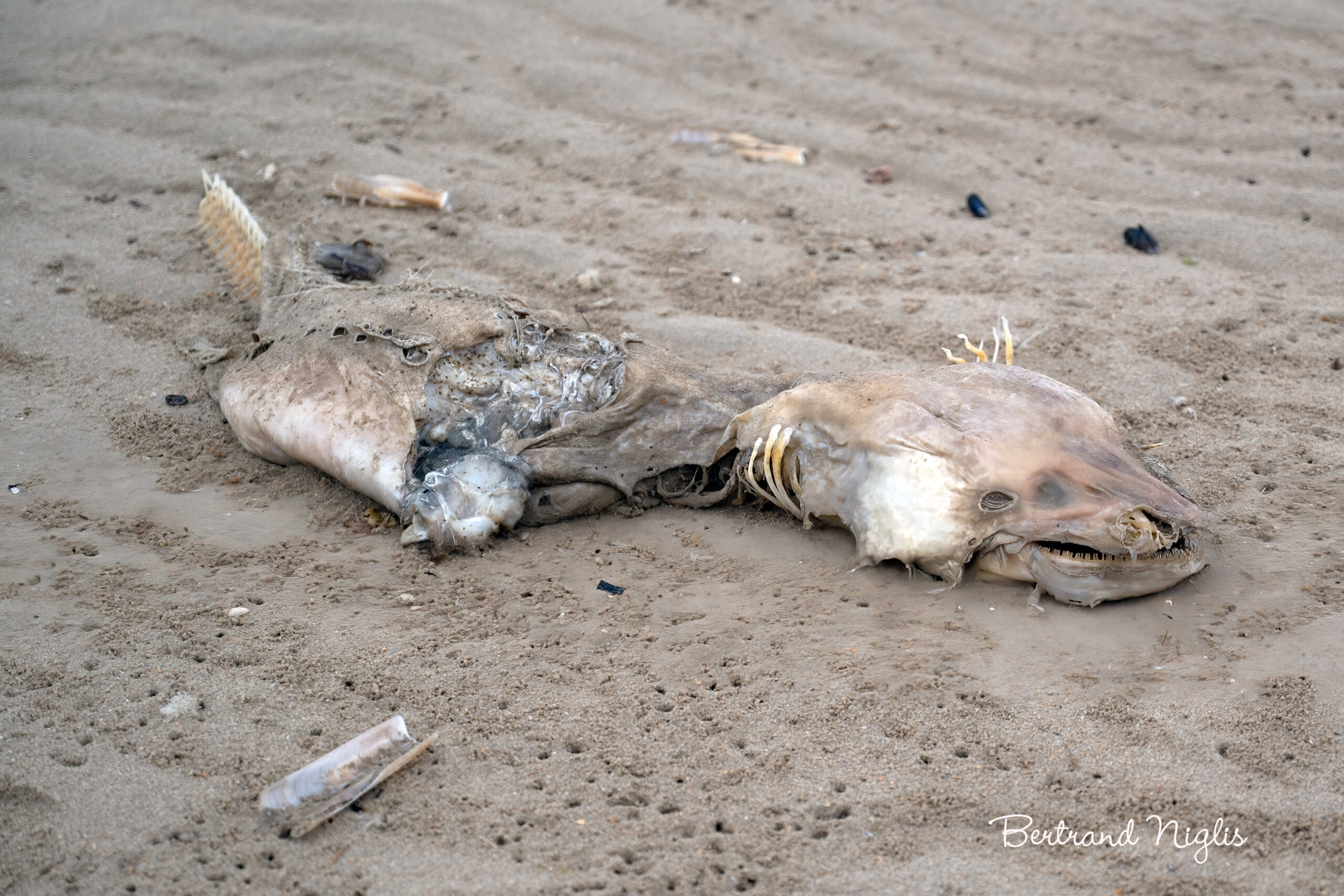 Cet animal échoué présente toutes les caractéristiques d’un Congre commun (Conger conger), l’un des plus grands poissons anguilliformes de nos mers. Il est reconnaissable à son corps cylindrique et puissant, sans écailles, recouvert d’un épais mucus. Un examen plus pointu de sa tête met en évidence l’une de ses principales armes : une dentition effrayante adaptée à son statut de prédateur. La mâchoire du congre est bordée de nombreuses petites dents coniques et très serrées, disposées en rangées rapprochées, formant une sorte de bord tranchant continu. Cette structure n’est pas faite pour broyer, mais pour saisir fermement les proies glissantes et déchiqueter la chair, témoignant de sa voracité. Le congre est un prédateur solitaire qui occupe une place élevée dans la chaîne alimentaire benthique. Essentiellement nocturne, il passe ses journées caché dans les failles rocheuses, les grottes ou les épaves, sortant à la tombée de la nuit pour chasser activement. Son régime alimentaire est strictement carnivore, composé de poissons, de crustacés (crabes, homards) et de céphalopodes (poulpes, seiches). En tant que prédateur de haut niveau et charognard, le congre joue un rôle écologique majeur en régulant les populations de fond et en nettoyant l’écosystème. Une fois adulte, sa taille et sa force lui confèrent très peu de prédateurs naturels, le plaçant au sommet de l’écosystème côtier. La découverte d’un tel spécimen rappelle la puissance et le mystère de la vie qui se cachent dans nos eaux.
