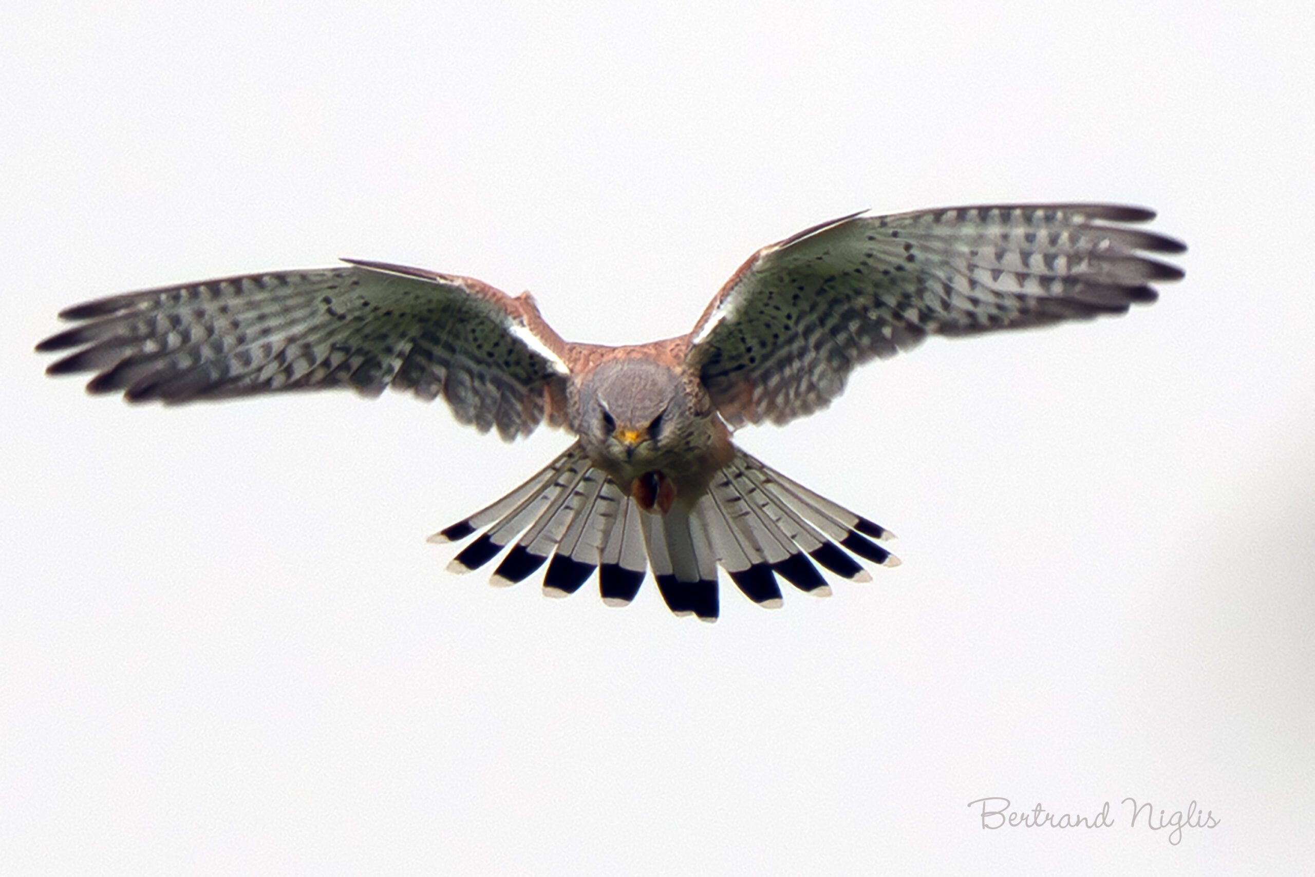 On a déjà eu l’occasion d’admirer dans ces pages le faucon crécerelle habituellement roux et beige au repos. Lorsque l’oiseau pratique le vol stationnaire, il se révèle dans