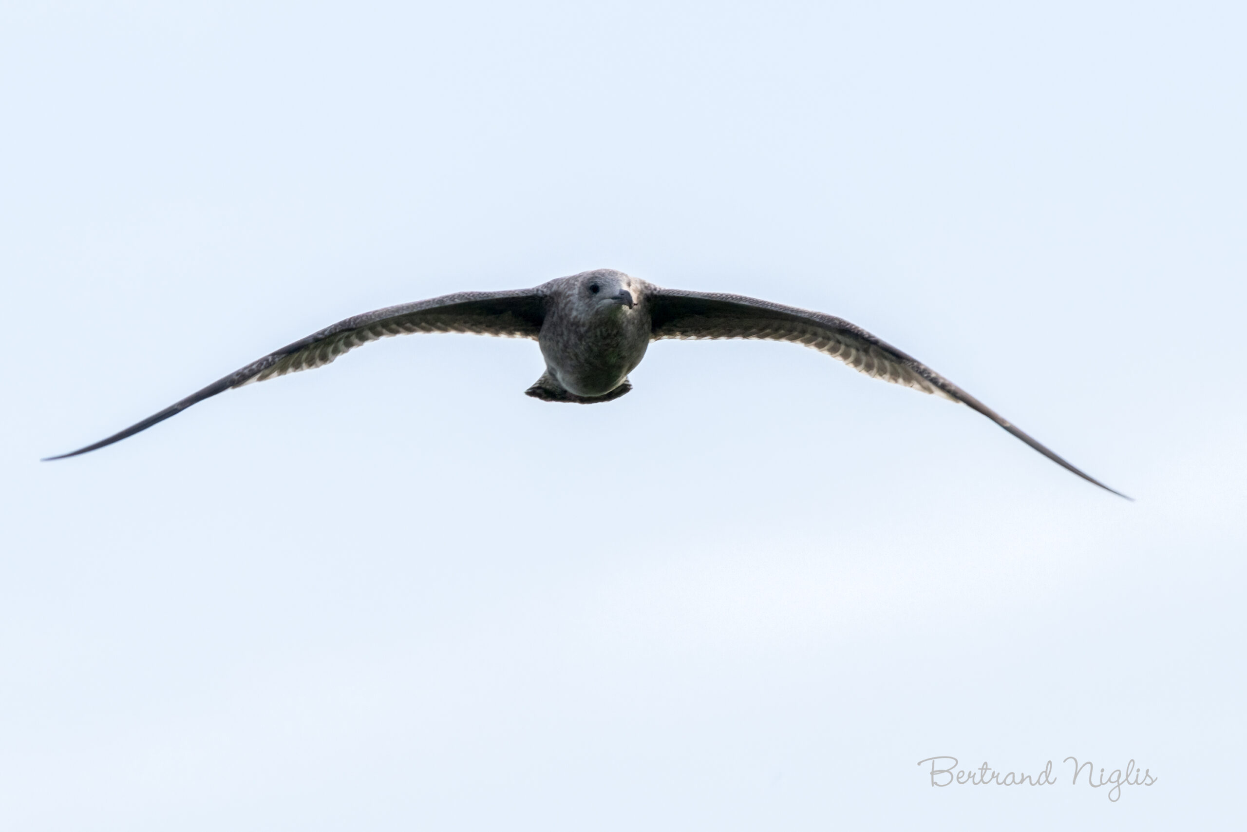 Début octobre, au large des majestueuses falaises du Bessin, le spectacle des grands goélands argentés et bruns en vol est saisissant. Ils croisent dans l’air avec une adresse et une assurance remarquables, leurs grandes ailes exploitant chaque courant. Parmi ces voiliers expérimentés se distingue un sujet immature, dont le plumage d’un mélange subtil de gris et de brun tacheté trahit la jeunesse. Malgré son jeune âge, il ne craint pas de s’approcher du sommet des escarpements. Son vol, puissant et stable, masque cependant un handicap visible : ses deux mandibules du bec sont nettement croisées, la partie supérieure apparaissant anormalement longue et désalignée. Cette malformation, qui n’est pas naturelle chez le goéland, suggère un possible traumatisme subi tôt dans sa vie ou une anomalie de croissance (trouble de la kératine) ayant empêché l’usure correcte. Quoi qu’il en soit, ce bec en ciseaux représente une menace sérieuse : il complique grandement la capture et la manipulation de la nourriture, entraînant un risque constant de carences et de faiblesse. De plus, il entrave le lissage des plumes, essentiel à l’isolation. Le fait que cet oiseau vole encore avec une telle vigueur témoigne d’une résilience exceptionnelle, mais sa survie quotidienne est sans nul doute une lutte incessante.