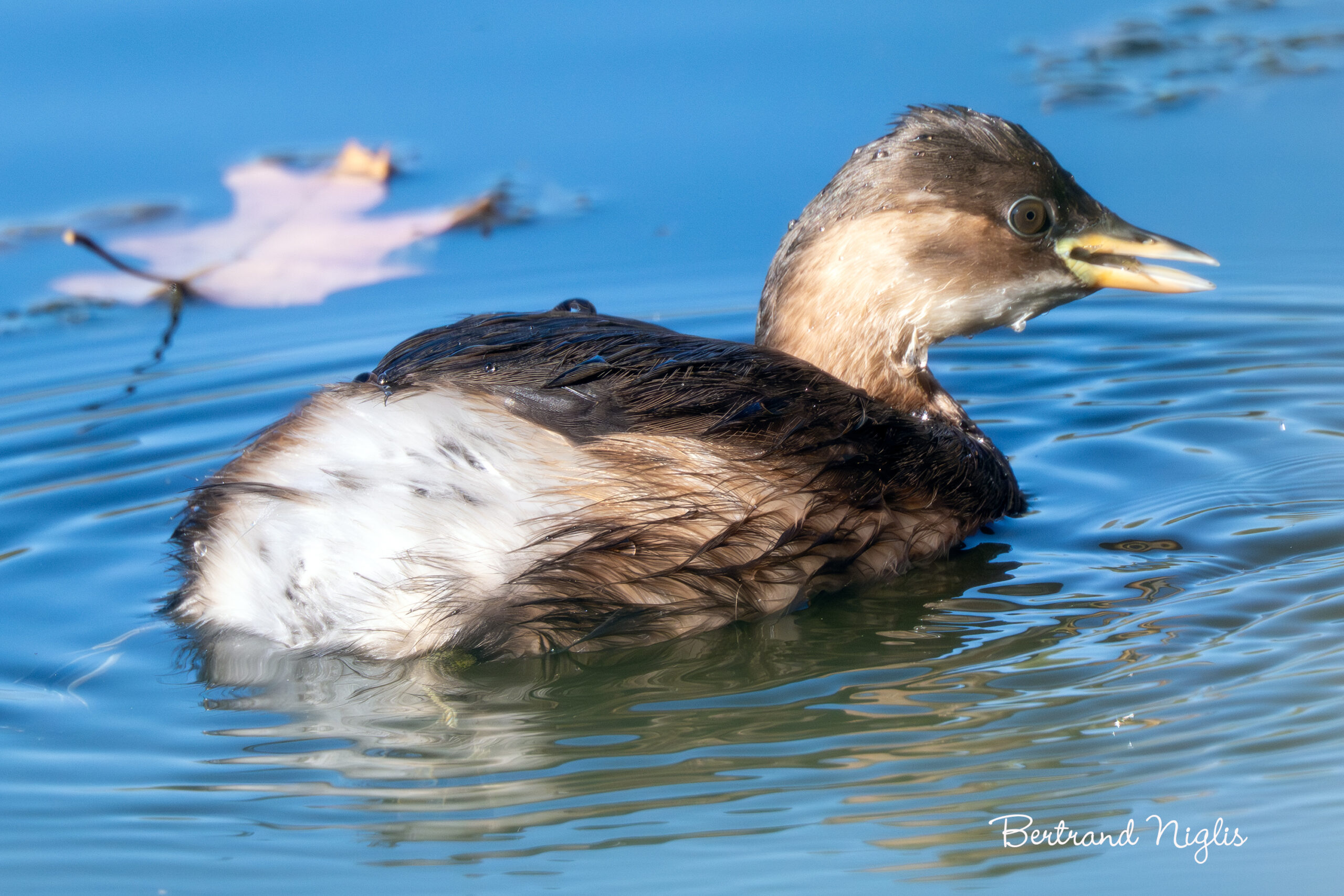 Le grèbe castagneux, le plus petit des grèbes d’Europe, est une petite boule de plumes dont la robe évolue grandement en cette saison. Il est en train d’achever sa mue, passant de son élégant plumage nuptial (tête noire, joues et cou châtains) à sa tenue d’automne et d’hiver, plus discrète. Il arbore désormais des tons bruns et chamois uniformes, le rendant plus difficile à repérer sur les eaux hivernales, ne conservant souvent que son bec court, noir à pointe claire. Sous l’eau, son agilité est sans égale. Il chasse en plongeant constamment, non pas pour de gros poissons, mais pour les petits invertébrés aquatiques : larves d’insectes, minuscules crustacés et mollusques à coquille fine. Cette prédilection le distingue de ses grands cousins, plus piscivores. La particularité la plus étonnante de son alimentation réside dans l’ingestion de ses propres plumes. Le grèbe s’en gave volontairement – et nourrit même ses petits avec – pour une raison vitale : dans le gésier, ces plumes forment une masse protectrice qui agit comme un filtre. Cette ingénieuse technique permet de broyer les coquilles dures et d’éviter que les arêtes de poisson et les parties chitineuses des insectes n’endommagent les parois de son système digestif.