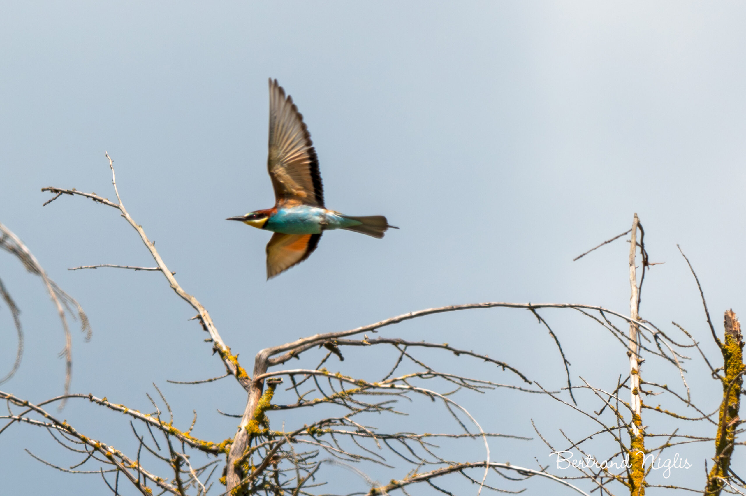 Bien que nommé guêpier d’Europe, ce bel oiseau multicolore est un grand voyageur puisqu’il passe une partie de l’année en Afrique, entre le Sénégal et le Ghana. Il nous revient au mois d’avril et conquiert de nouveaux territoires à la faveur du réchauffement climatique. Pour nicher, le plus souvent en colonies, les guêpiers recherchent les berges sablonneuses des cours d’eau et les falaises argileuses dans lesquelles ils creusent des terriers dont la construction s’étale sur trois semaines pour atteindre deux mètres de profondeur. Après avoir nourri leurs petits dans la chambre de ponte, ils en sortent en marche arrière. Cet oiseau se nourrit principalement d’hyménoptères – guêpes, abeilles, bourdons, frelons – mais d’autres insectes également, coléoptères, diptères, papillons et libellules. Bien qu’insensible à leur piqûres, le guêpier préfère neutraliser sa victime en l’assommant avant qu’elle ne dégaine son dard ; ensuite seulement il l’avale en renversant la tête en arrière. De grands rassemblements peuvent être observés au courant du mois d’août, avant le périple risqué qui leur fera traverser la Méditerranée : ils doivent échapper aux faucons d’Eléonore qui pour nourrir leurs petits, s’attaquent à eux.