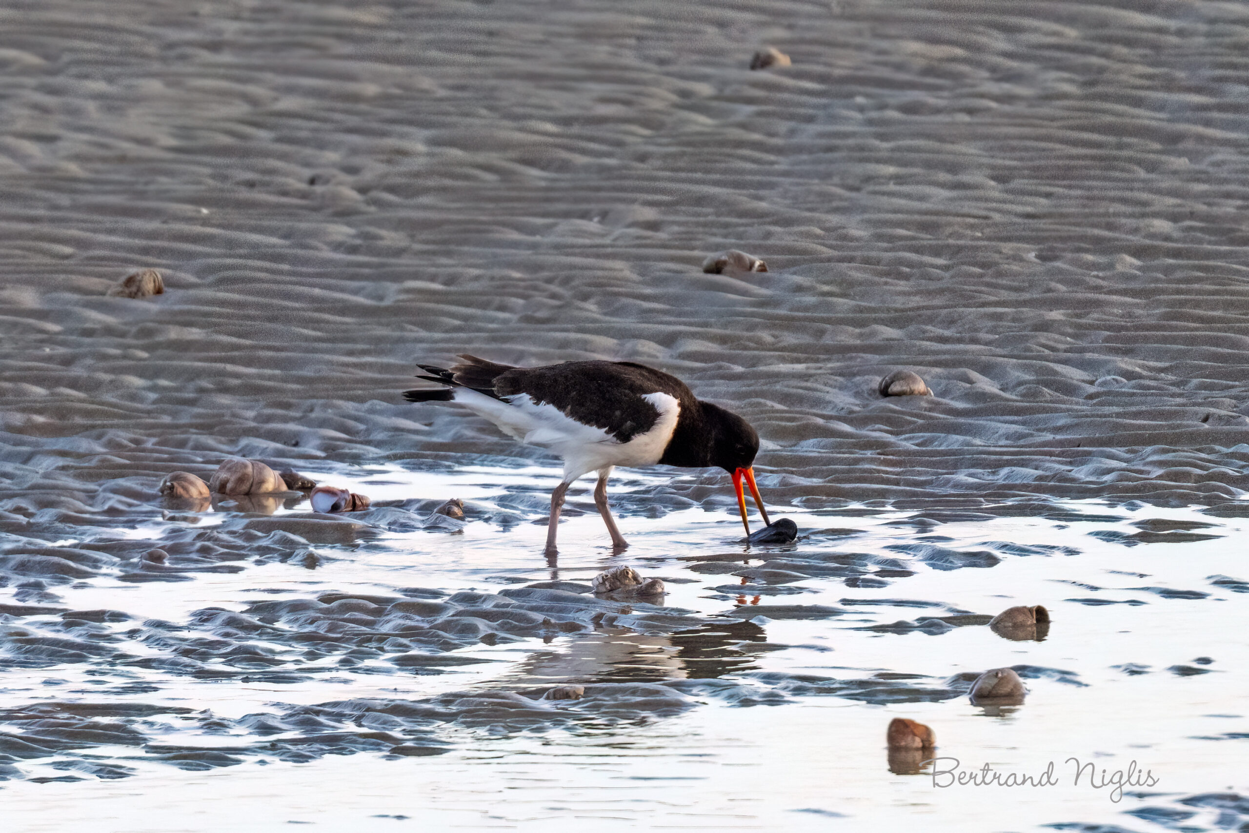 En cette fin de septembre sur la plage de Gatteville, alors que la marée se retire, l’huitrier pie se met au travail. Cet échassier reconnaissable à son plumage noir et blanc et à son long bec rouge orangé est affairé à se nourrir des mollusques découverts sur l’estran. Son bec est l’outil d’une adaptation exceptionnelle. L’oiseau utilise deux techniques principales pour ouvrir les bivalves comme les moules : le martelage (frapper la coquille pour la briser) ou, comme on peut l’observer, le décorticage. Cette méthode consiste à insérer l’extrémité du bec, qui agit comme une lame et un coin, dans l’interstice des valves pour sectionner le muscle adducteur qui maintient la coquille fermée. Ironiquement, malgré son nom d’« Huitrier », il consomme très rarement des huîtres adultes, dont la coquille est trop robuste, lui préférant les moules et les coques. En cette saison post-reproduction, l’oiseau peut apparaître seul pour se nourrir, mais son comportement social est cyclique : il est grégaire en automne et en hiver, se regroupant en grands dortoirs de protection. Les individus qui se reproduisent localement sont sédentaires, mais la population est massivement rejointe par des migrateurs hivernants venus du nord, amplifiant l’animation des côtes.