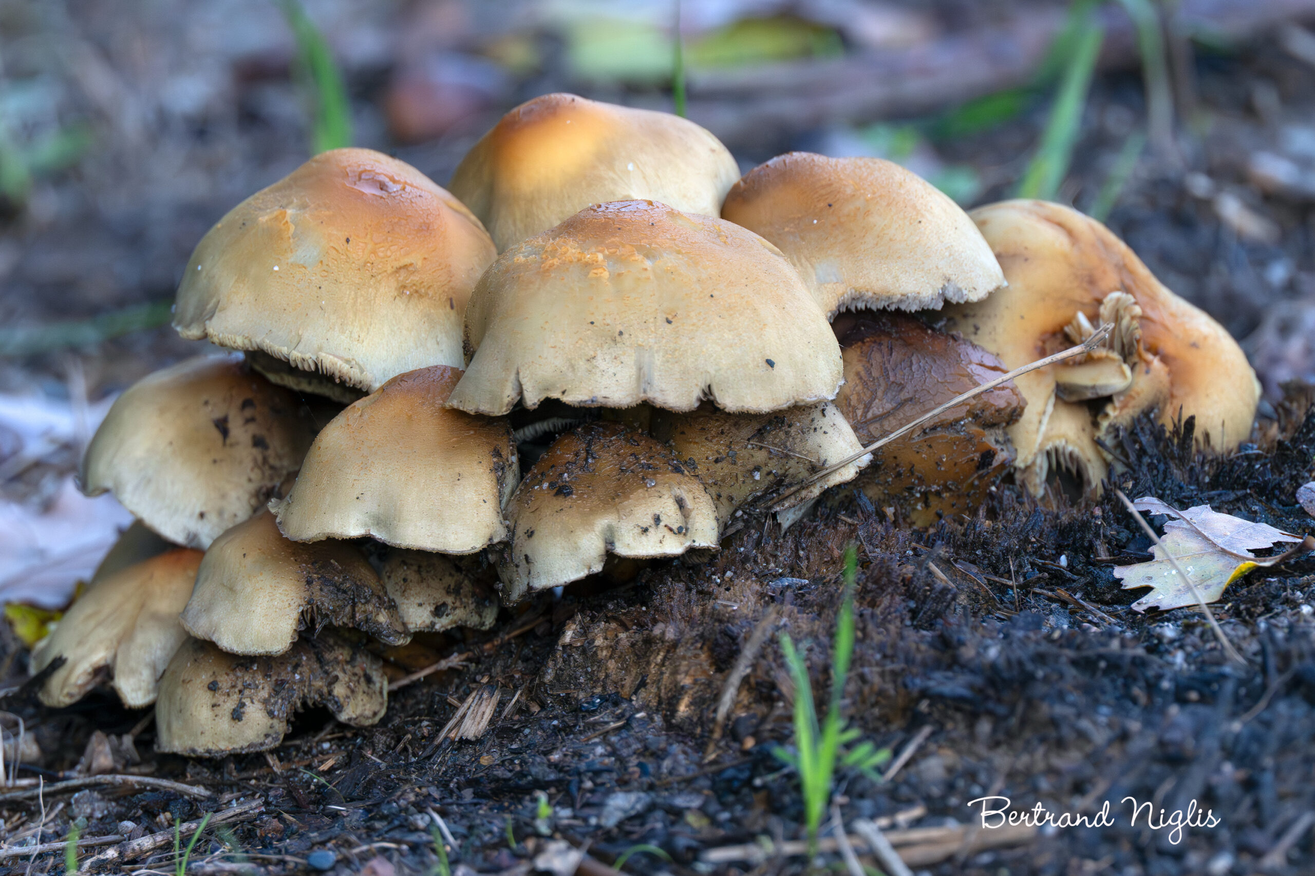 L’hypholome en touffe (Hypholoma fasciculare) est l’un des champignons les plus communs et les plus visibles de nos écosystèmes forestiers. Il est facilement reconnaissable par sa croissance cespiteuse (en touffes denses), souvent sur les souches, les racines ou le bois mort. Son sporophore (la partie visible) présente un chapeau de 3 à 7 cm, de couleur variant du jaune soufre au brun-roux et des lames qui passent du jaune au gris-verdâtre en vieillissant. Malgré son abondance, il est réputé pour sa saveur très amère et est considéré comme toxique, provoquant des troubles gastro-intestinaux. Son rôle le plus important est écologique : il s’agit d’un saprotrophe lignicole, essentiel au recyclage de la matière. Son cycle de vie commence avec la spore, qui, une fois libérée par le vent, germe sur le bois mort. La spore donne naissance au mycélium, un vaste réseau de filaments qui pénètre le substrat. Ce mycélium est le véritable corps du champignon et sa phase de vie la plus longue. En tant que décomposeur, il déploie des enzymes puissantes pour dégrader les composants rigides du bois (lignine et cellulose), initiant un processus appelé pourriture blanche. Une fois les ressources accumulées, le mycélium produit les sporophores que nous observons. Ces fructifications ont pour unique fonction de former de nouvelles spores, fermant ainsi la boucle et assurant la continuité du recyclage de la forêt.