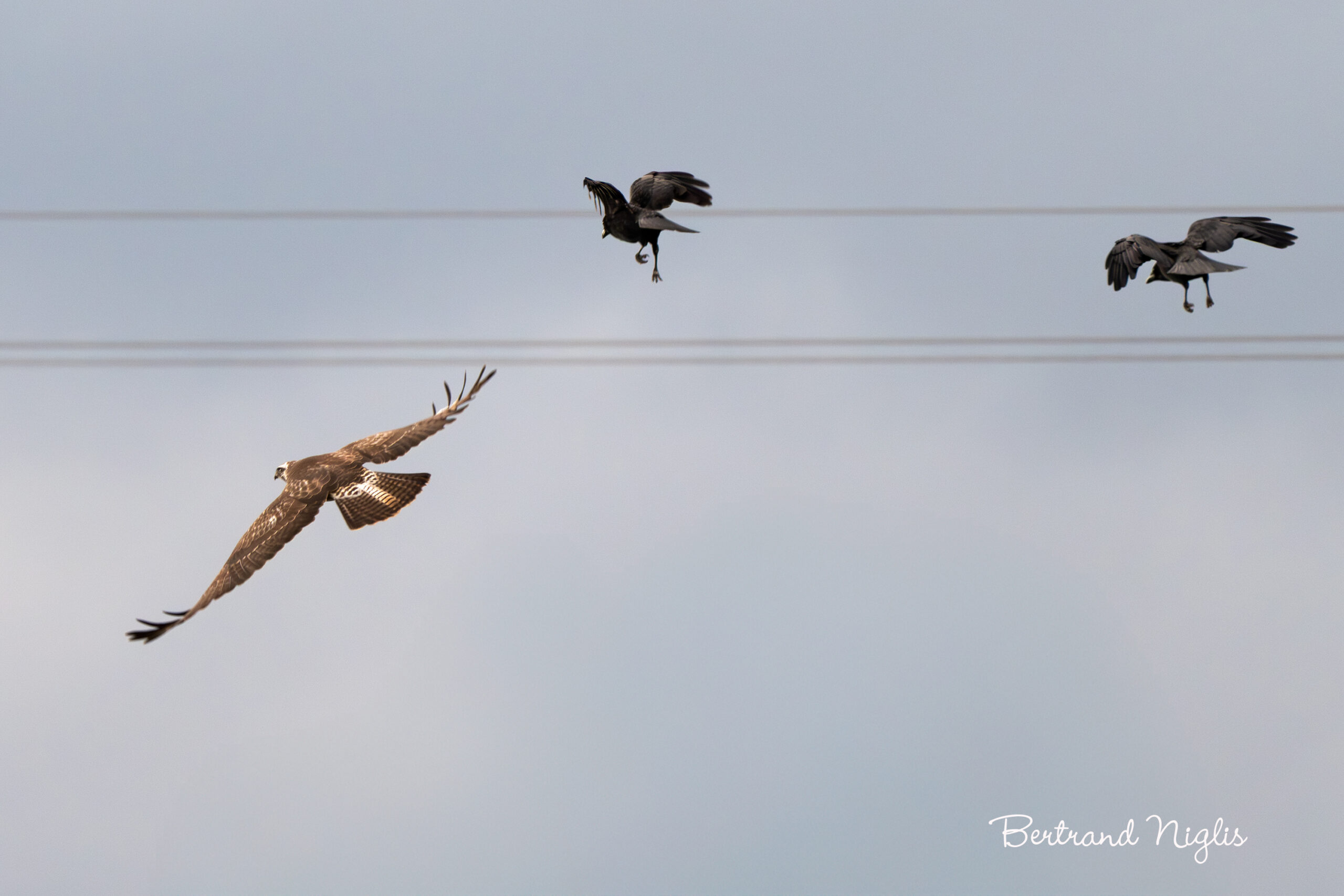 Alors que les premiers flocons de neige tombent sur le sommet des montagnes, la faune est engagée dans une lutte pour la survie. C’est dans ce contexte de début de disette que la buse variable, un grand rapace opportuniste au plumage brun-roux, a pris son envol. Elle prospecte le paysage à la recherche des rares petits rongeurs ou d’une charogne qui pourrait lui assurer sa subsistance. Aussitôt repérée, l’intruse est interceptée par deux corneilles noires. Bien qu’elles ne soient plus en période de nidification, ces dernières défendent farouchement leur territoire. Le harcèlement aérien est enclenché sans délai. Les corvidés prennent de l’altitude pour effectuer des piqués et intimider… L’affrontement ne dure pas longtemps. La buse préfère conserver son énergie vitale, étendant ses ailes larges pour s’éloigner sans engager le combat. Dans cette scène brève et violente, la loi de la conservation est respectée : le grand oiseau cède face à l’agressivité coordonnée des plus petits, contraint de poursuivre sa quête de nourriture dans un territoire moins disputé.