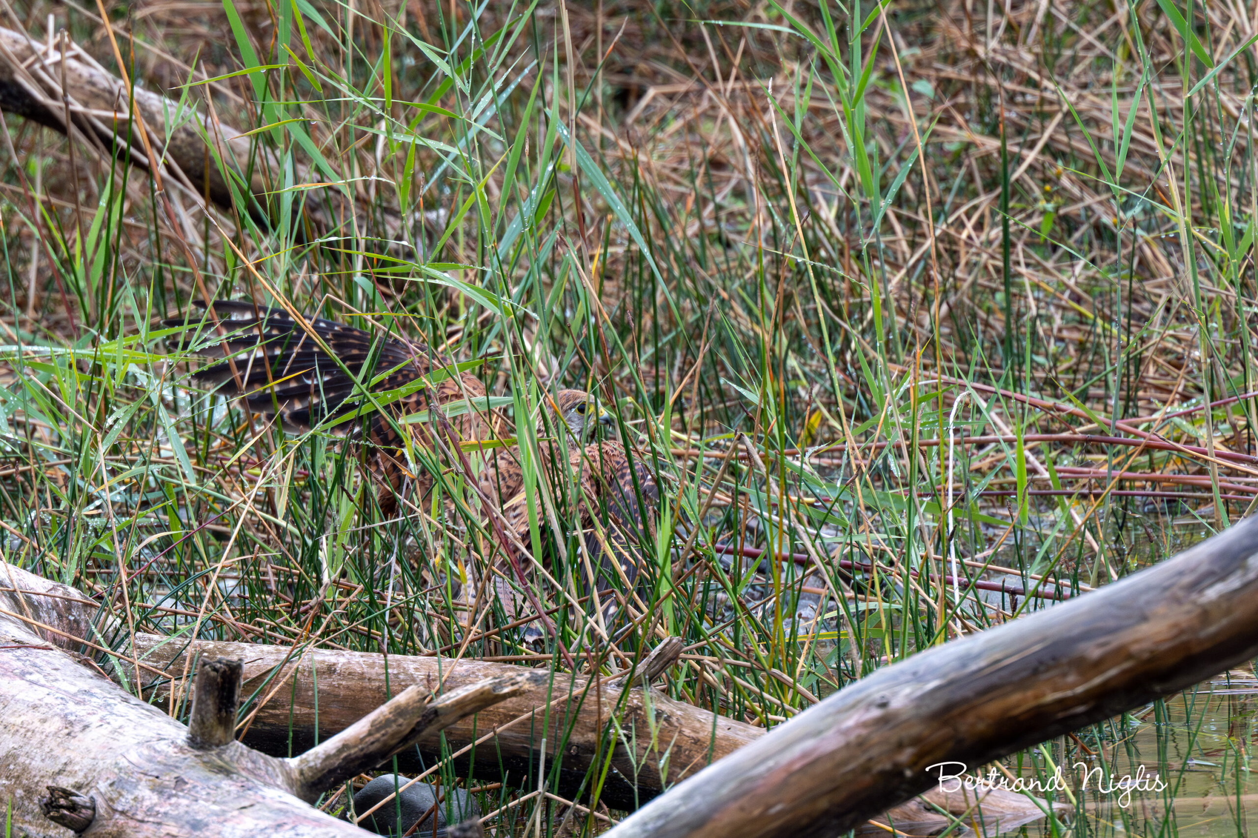 Le Faucon crécerelle est une silhouette familière, souvent aperçue en vol stationnaire ou posée sur un perchoir à la recherche de proies. C’est pourquoi l’observation d’un tel rapace en pleine toilette, et plus encore en train de prendre un bain, constitue un moment d’exception pour tout observateur. Fin septembre, au Rothmoos, c’est dans une mare isolée, à l’abri des regards, qu’il a choisi de s’immerger. Pour un oiseau, le bain n’est pas un luxe, mais un impératif de survie. Il prend une importance stratégique en période de mue, lorsque le plumage est renouvelé. L’eau permet de décoller les résidus, la poussière et les parasites, une étape vitale pour assurer la fonctionnalité et l’imperméabilité des nouvelles plumes. Après le bain, l’oiseau peut lisser et graisser plus efficacement son manteau, garantissant l’isolation thermique et la performance en vol. Cependant, ce moment d’hygiène s’accompagne d’un risque majeur. Complètement imbibé d’eau, le rapace perd sa légèreté et son aérodynamisme, le rendant extrêmement vulnérable à toute menace. L’oiseau, incapable de s’envoler rapidement, a dû batailler pour se hisser sur une branche et secouer l’excès d’eau. Ce n’est qu’après une lourde tentative qu’il a pu enfin s’arracher de l’eau et reprendre les airs, laissant derrière lui le souvenir précieux de cette intimité furtive.