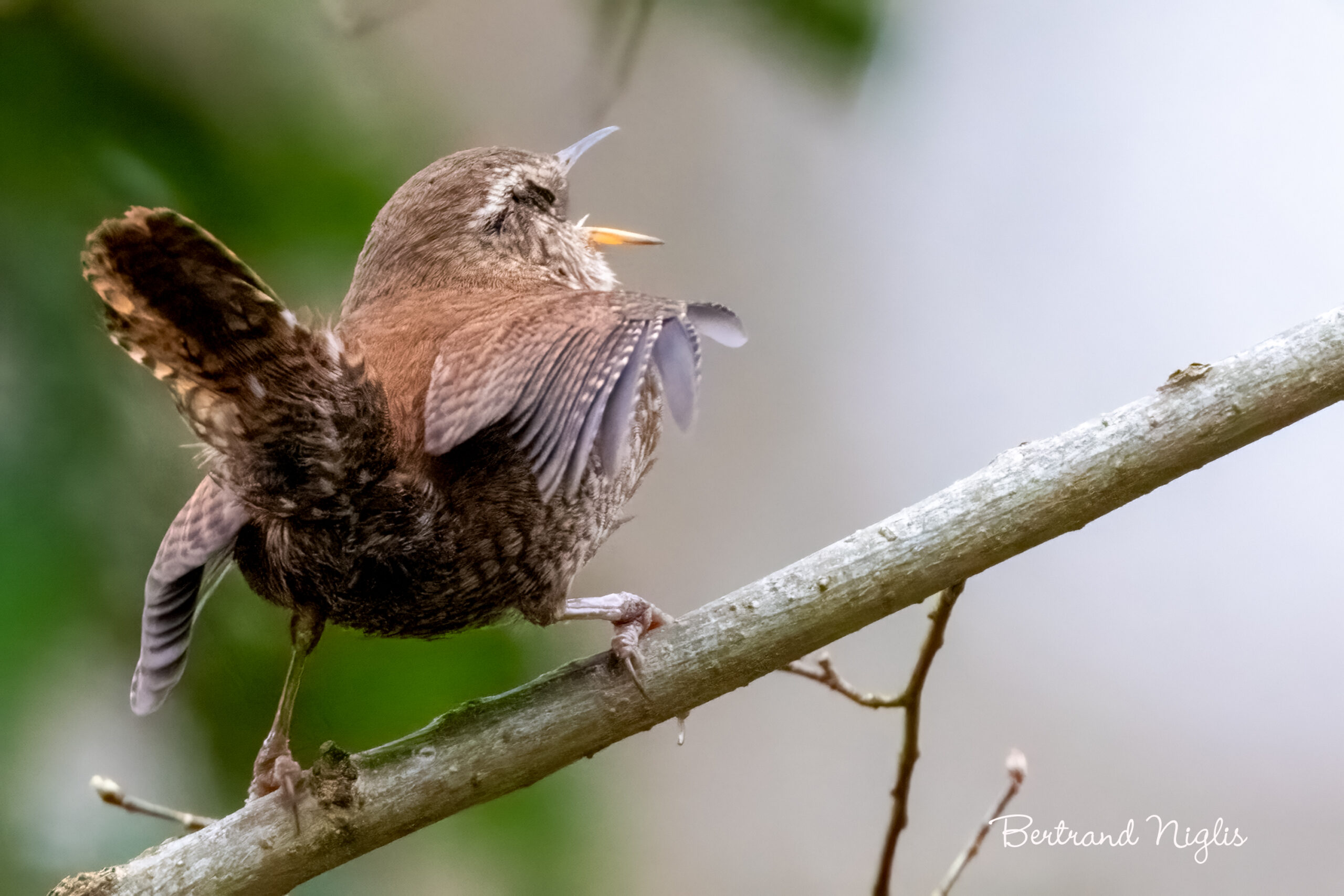 La rencontre avec un Troglodyte mignon au chant est un paradoxe de la nature : dix grammes de plumes brunes qui s’imposent avec la puissance d’un ténor. Sur son arbuste, l’oiseau ne se contente pas de chanter ; il livre une performance athlétique totale. Le bec grand ouvert, la queue dressée et les ailes frémissantes, il utilise son corps entier comme une caisse de résonance pour projeter ses 90 décibels à travers la forêt. Cette agitation des ailes n’est pas qu’un simple débordement d’énergie ; c’est un signal visuel puissant qui renforce son message sonore. Grâce à sa syrinx double, il produit des trilles complexes et des cascades de notes métalliques à une cadence phénoménale, créant une véritable clôture acoustique. En s’égosillant ainsi, il agit en maître des lieux, marque son territoire et prévient tout rival que ce coin de chemin forestier est sa forteresse. C’est le spectacle fascinant d’un cœur vaillant qui, par la seule force de son souffle, parvient à exister bien au-delà de sa minuscule silhouette.