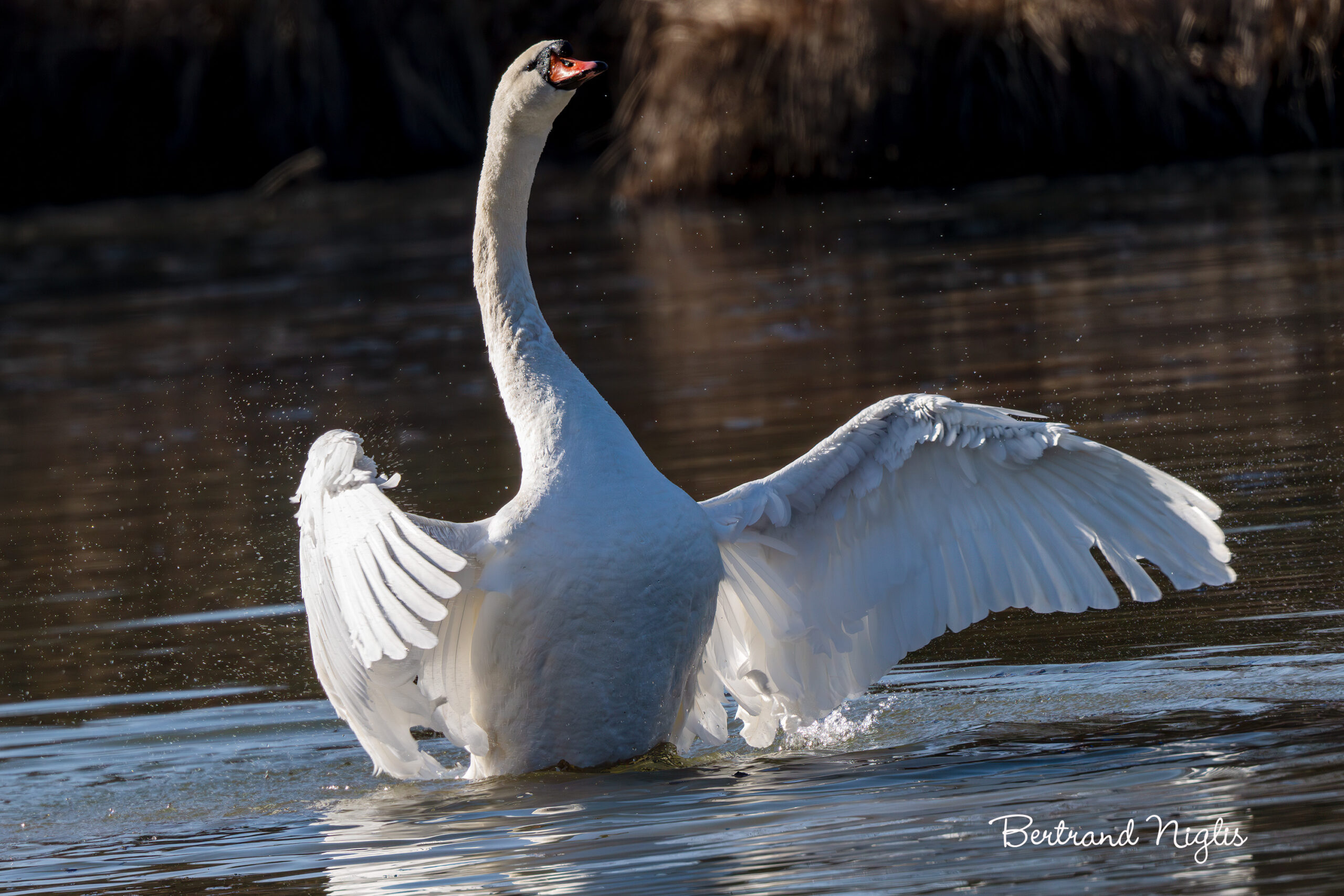 Après le lavage vient le moment de l’essorage. Le cygne se dresse verticalement sur l’eau et bat des ailes bruyamment, utilisant la force centrifuge pour expulser l’excédent d’eau. C’est l’un des moments les plus impressionnants : on réalise alors la puissance musculaire nécessaire pour soulever hors de l’eau un corps pouvant peser jusqu’à 13 kg. Cet ébrouement permet aussi de remettre grossièrement en place les grandes plumes de vol (rémiges) avant le travail de précision.