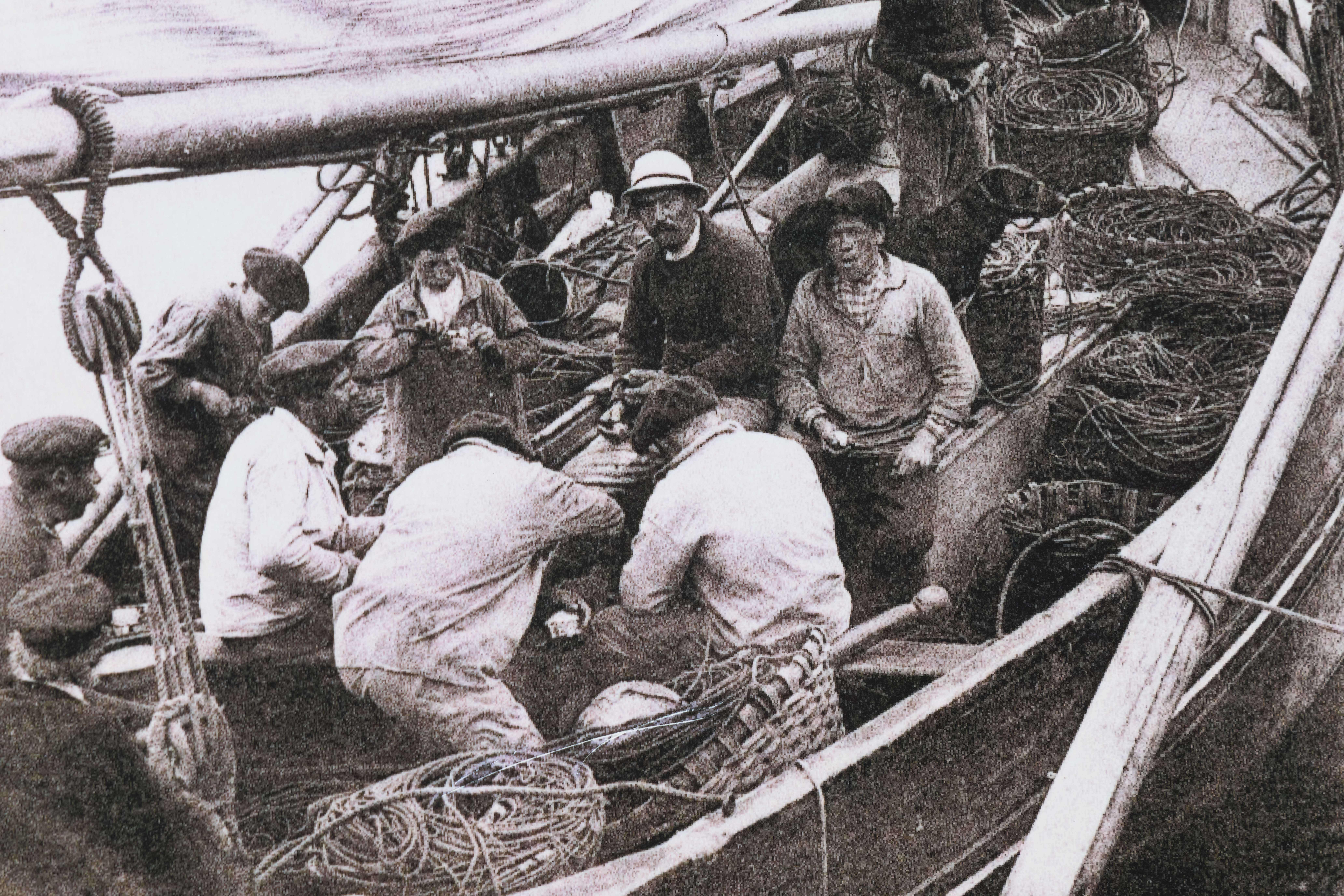 Dans le cadre d’une exposition historique sur le port de Barfleur, un cliché en noir et blanc rappelle la rudesse de la pêche artisanale il y a plus d’un siècle. L’image est centrée sur un groupe de sept marins regroupés sur le pont, occupés à des tâches manuelles. Leurs visages, marqués par le vent et le labeur, sont encadrés par des casquettes ou des bonnets de marin. Leurs vêtements sont simples et fonctionnels, adaptés à la vie rude en mer. Le bateau lui-même est un vieux gréement en bois. Les plans de travail sont envahis par les cordages épais, entassés en grosses bottes, ainsi que par d’autres éléments de l’accastillage. Cette structure navale et cet équipement témoignent de la dépendance à la seule force physique et à l’expérience traditionnelle pour naviguer et pêcher. La densité des hommes sur un espace réduit, travaillant de concert, évoque une vie communautaire intense. La préparation observée n’est que le prélude à une campagne de pêche longue, difficile et périlleuse, où les hommes devront affronter les éléments sans l’aide de la technologie moderne.