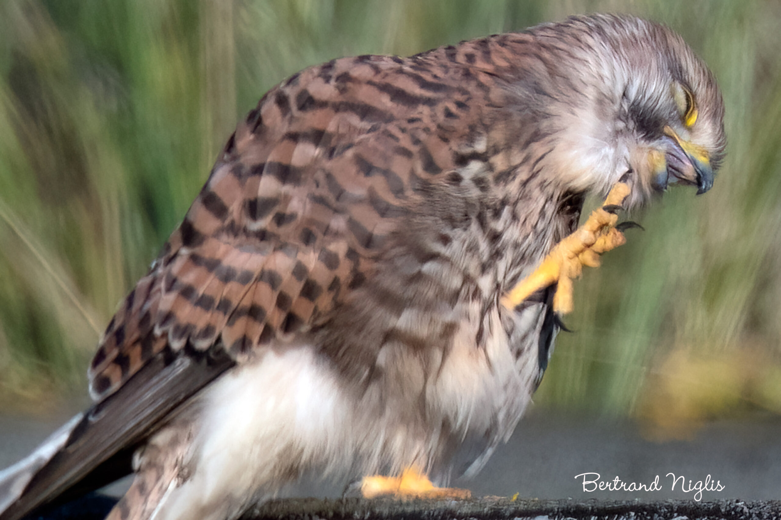 C’est au sein de la réserve naturelle de Vauville, que l’on a pu observer ce faucon crécerelle en pleine séance de toilette, offrant une vue exceptionnelle sur l’intérieur de son bec. Le bec du crécerelle est une pièce maîtresse de son anatomie, parfaitement adapté à son rôle de chasseur. Extérieurement, il est court, puissant et fortement crochu, ce qui est essentiel pour déchiqueter la chair de ses proies, principalement des micromammifères et des insectes. La caractéristique la plus notable, visible à l’extrémité de la mandibule supérieure, est la petite dent tomiale (ou « dent de faucon »). Cet aiguillon osseux, typique des falconidés, permet au rapace de sectionner la nuque de sa proie pour une mise à mort rapide. L’ouverture du bec révèle une structure interne fascinante, optimisée pour la manipulation de la viande. La surface du palais (mandibule supérieure) n’est pas lisse, mais tapissée de crêtes cornées transversales qui agissent comme une « râpe » ou une surface antidérapante, assurant une prise ferme sur la nourriture et facilitant son acheminement vers la gorge. On distingue également la fente choanale, une ouverture centrale reliant la cavité buccale aux voies nasales. Enfin, des papilles pharyngiennes, orientées vers l’arrière, tapissent l’arrière de la cavité buccale pour garantir que les morceaux de viande ne puissent pas ressortir une fois engagés.