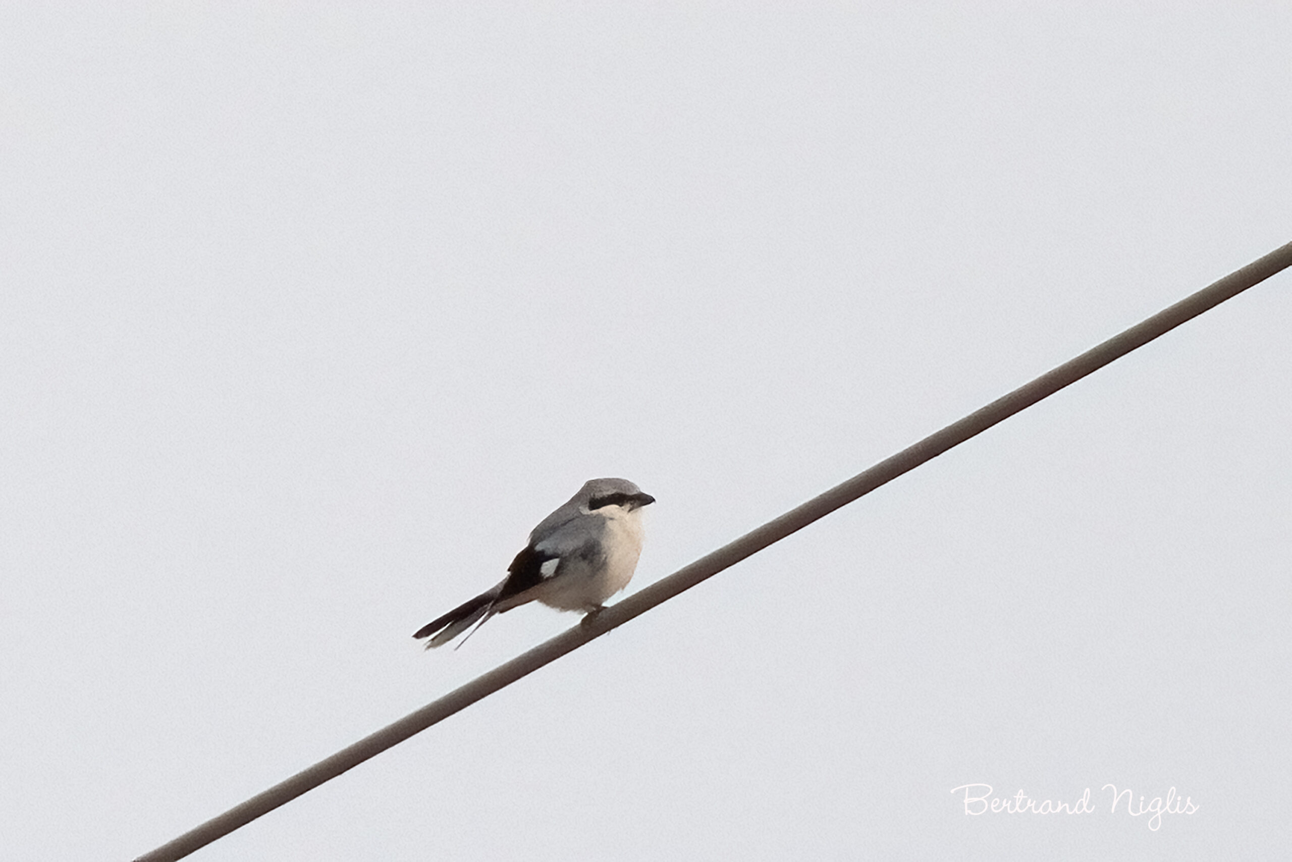 Pour une fois, on va citer en premier son nom scientifique, Lanius excubitor,  qui signifie littéralement « le boucher qui surveille » ! C’est la pie-grièche grise dont il est question ici, photographiée lors d’une halte migratoire. Cet oiseau de la taille d’un Merle noir se distingue par un plumage d’un élégant contraste : le dos, la nuque et la calotte sont d’un gris perle clair, tandis que la gorge et le ventre sont d’un blanc pur. L’oiseau porte un masque noir bien défini s’étendant du bec jusqu’à l’arrière de l’œil. En vol, le contraste entre les ailes noires et le large miroir blanc est particulièrement visible. Son bec est fort et crochu, témoignant de son statut de prédateur capable de chasser des proies plus grosses, des insectes aux micromammifères, qu’elle empale dans ses fameux « lardoirs ». En France, la Pie-grièche grise est une espèce en fort déclin. En tant que nicheuse, elle subsiste dans des bastions très fragmentés dans les zones d’élevage extensif des massifs montagneux et des hauts plateaux, comme le Haut-Doubs et le Jura ou le sud de la Champagne-Ardenne. Durant l’hiver et en migration tardive on peut l’observer dans les milieux ouverts (prairies, lisières forestières, friches) jalonnés de perchoirs d’affût bien visibles, tels que les poteaux, les piquets de clôture ou les cimes d’arbres isolés.