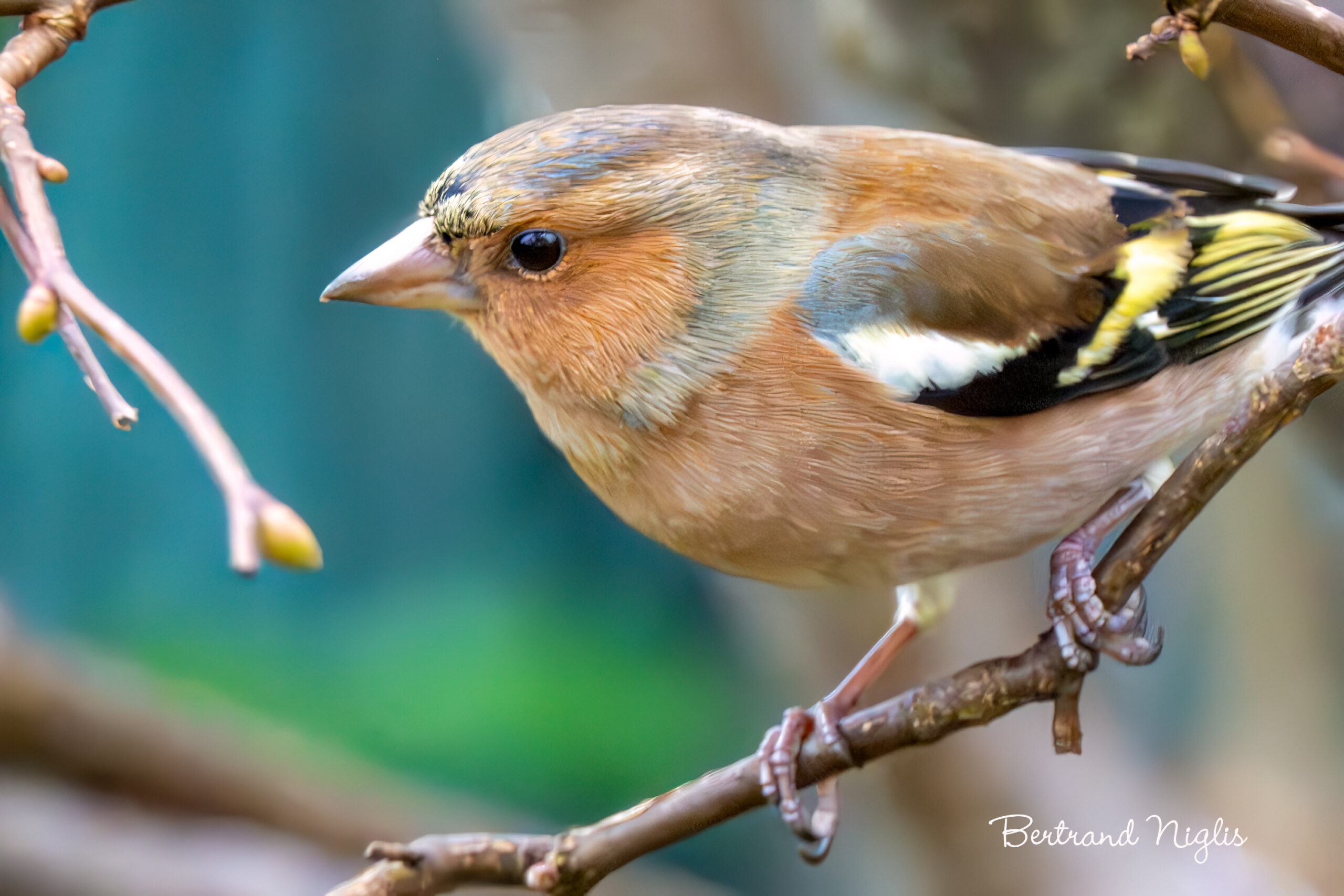 On connaît tous l’expression « gai comme un pinson ». Elle fait référence à son chant enjoué et inventif qui témoigne d’une joie de vivre. Si l’humeur d’une personne peut également s’exprimer dans les habits qu’il porte, on pourrait en dire autant de l’oiseau qui, en ce début d’hiver prépare son habit nuptial. On distingue encore les pointes brunes des plumes de la calotte et la nuque, mais déjà le gris-bleu ardoisé commence à ressortir. De même, sur le front, juste au-dessus de la base du bec, on devine une petite zone plus sombre, presque noire. Les joues et la gorge arborent une teinte brun-roux saumoné qui s’étend sur tout le dessous de la tête. Le plumage alaire constitue la partie la plus graphique du pinson. Les petites couvertures forment la grande tache blanche sur l’épaule; elles tranchent avec les grandes couvertures noires, aux extrémités blanches. Les rémiges, grands plumes de vol, sont noirâtres avec de fins liserés jaune-vert sur les bords extérieurs. Le bec, actuellement corne clair, deviendra bleu acier au printemps. C’est la combinaison de bleu acier sur la tête et de brun-rose sur la poitrine qui rend le mâle si élégant.