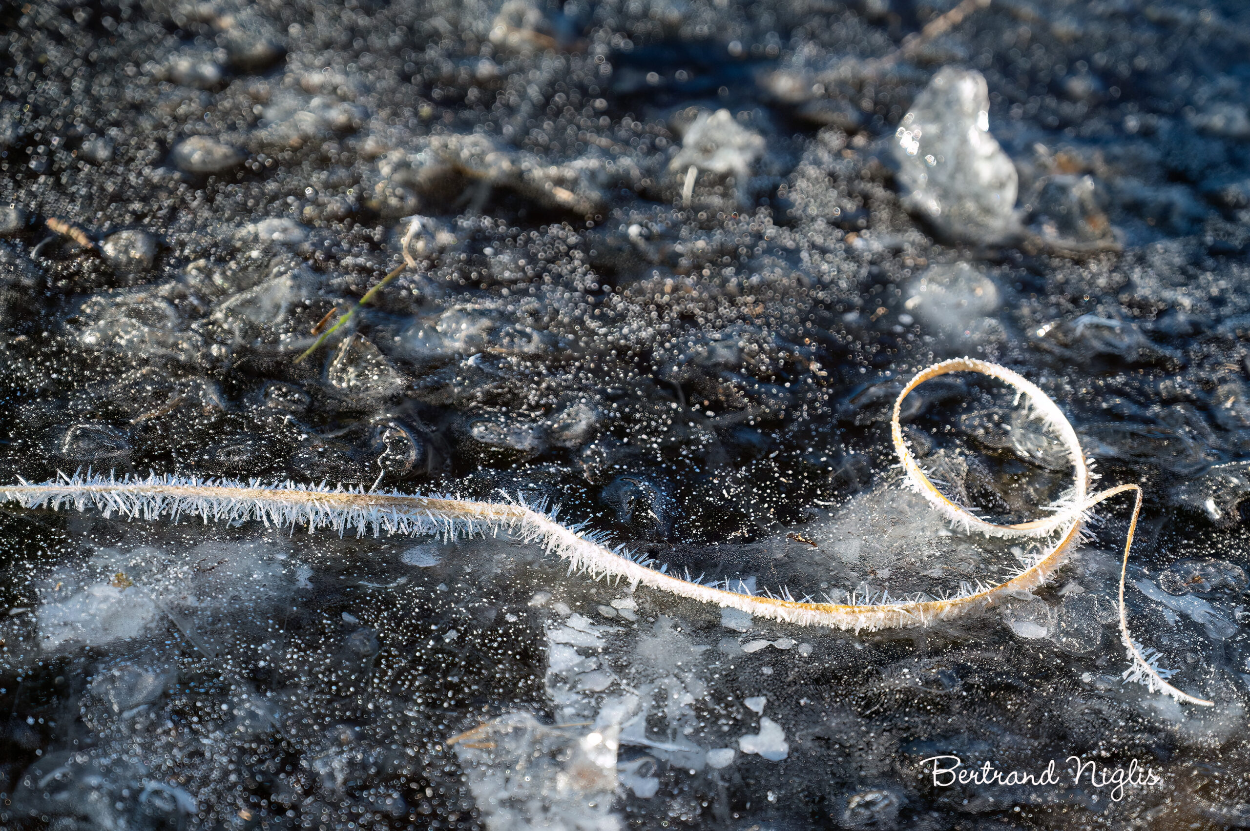Depuis quelques jours, le froid s’est abattu sur la vallée avec la précision d’un tueur. La bête est brutale, sans merci. Elle a entrepris de figer les eaux du lac, transformant le clapotis en une dalle de goudron translucide, une prison de verre sombre où l’air reste piégé en bulles agonisantes. Elle se venge d’avoir été tenue à distance par la douceur des derniers automnes ; elle revient restaurer son règne de terreur. L’assaut est total. Le givre ne se contente pas de tomber : il mord, il se fait dague, il transperce. Les plantes sont les premières victimes, saisies au cou par ce baiser de glace qui les change en statues cassantes. On sent que ce n’est qu’un coup de semonce : d’autres épisodes, plus cruels encore, achèveront de pétrifier le paysage. Mais la bête est orgueilleuse. Pour que nul n’ignore son retour, elle prend le temps de signer son crime. Ce brin d’herbe, hérissé de fils de verre, est le sceau dont elle marque le silence pour signifier que la vie a perdu la partie. L’hiver règne à présent.