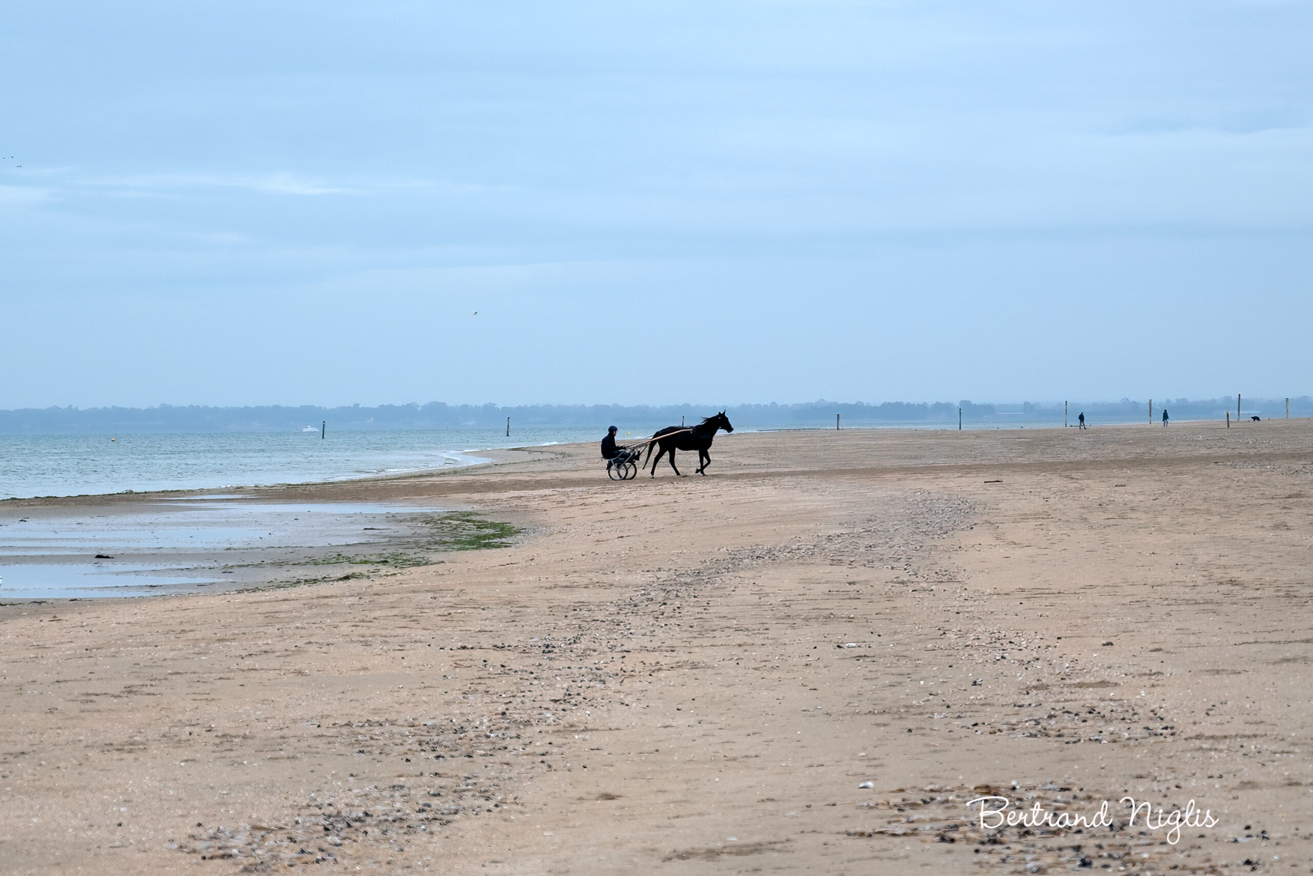 Sur les vastes étendues de sable de la plage historique d’Utah Beach, en Normandie, l’ambiance est loin du souvenir des combats. Chaque matin, le lieu se transforme en un centre d’entraînement naturel et éphémère. L’image capture un moment de concentration et de puissance : un trotteur lancé au travail, attelé à son sulky, le driver silencieusement concentré. C’est ici, sur ce littoral réputé pour son élevage de chevaux de course, que les champions se forgent. L’entraînement sur la plage n’est pas un simple plaisir, mais une technique d’excellence. En travaillant les pattes dans l’eau, les chevaux profitent d’une véritable thalassothérapie naturelle. La résistance de l’eau permet de muscler en profondeur sans traumatiser les articulations, tandis que l’air marin et le sol souple sont une bénédiction pour leurs tendons et leur moral. Un spectacle à la fois insolite et magnifique, où la force de l’animal se mêle à l’immensité du paysage, loin du tumulte des hippodromes. Une tradition normande qui unit l’histoire et la passion du cheval.