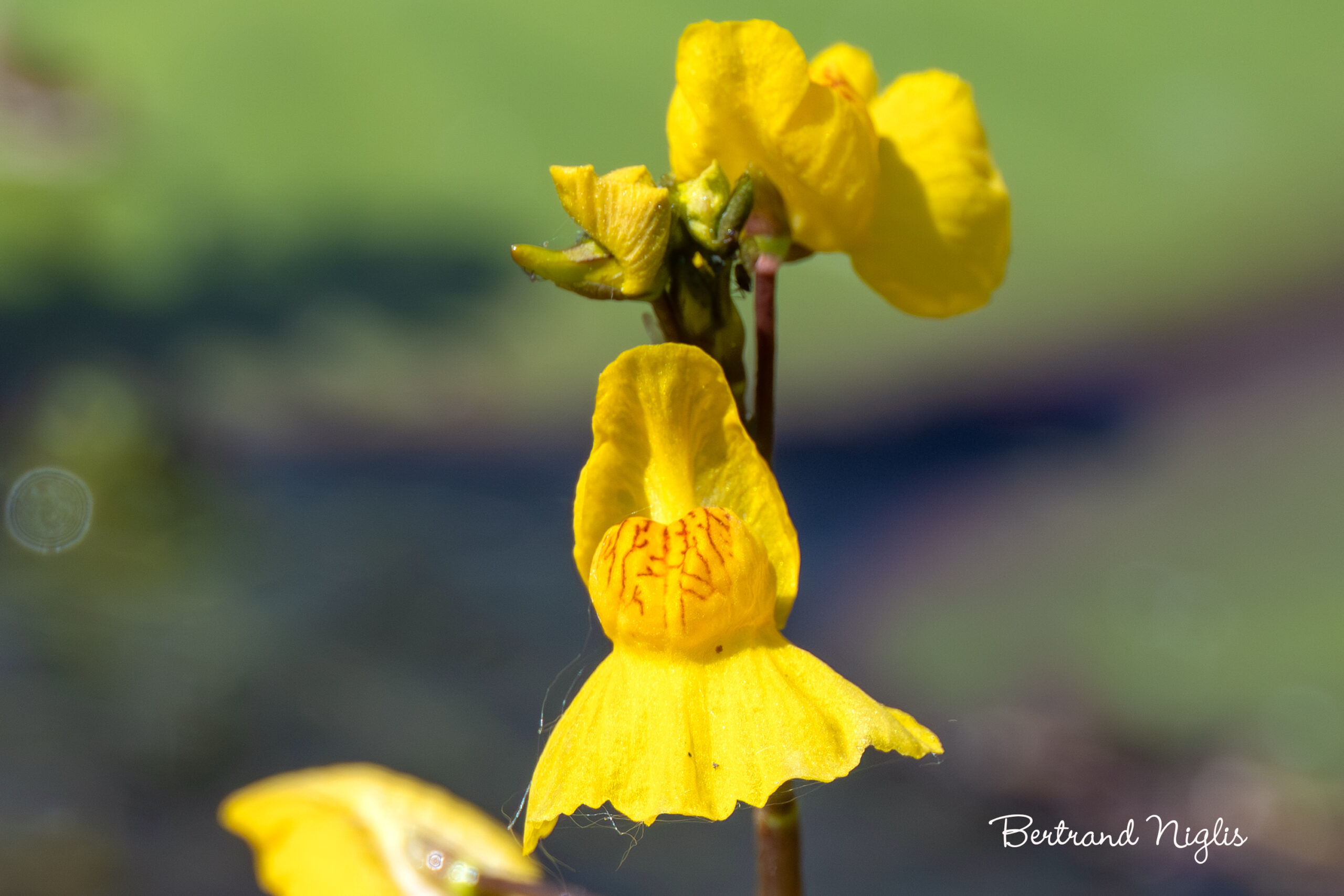 Il ne faut jamais se fier aux apparences. Voilà une belle plante qui colonise la surface de la mare et la parsème de taches jaunes. Elle parait fragile mais n’est pas aussi innocente qu’elle en a l’air. Il s’agit de l’utriculaire vulgaire, une plante carnivore commune des eaux calmes d’Europe. Dépourvue de racines, elle flotte librement sur la surface, soutenue par ses tiges et ses feuilles finement découpées. C’est lors de la floraison, en été, qu’elle se fait remarquer, érigeant hors de l’eau une hampe florale ornée de plusieurs fleurs jaunes évoquant de petites orchidées, souvent agrémentées de lignes ou de taches rouges. Son mode de nutrition est l’un des plus sophistiqués du règne végétal. Elle ne capture pas ses proies à l’aide de feuilles collantes, mais utilise de minuscules sacs appelés utricules, qui sont en réalité des feuilles modifiées. Chaque utricule est une petite poche en forme de poire mesurant entre 1 à 5 mm, fermée par une trappe et dotée de soies sensorielles. Lorsqu’un petit crustacé ou une larve d’insecte touche l’une de ces soies, la trappe s’ouvre brusquement, créant une aspiration. La victime est alors avalée en une fraction de seconde à l’intérieur de l’utricule où elle est digérée par des enzymes. Ce mécanisme de capture ultra rapide est une prouesse biologique unique, qui permet à l’utriculaire de se procurer des nutriments essentiels dans des environnements pauvres en nutriments.