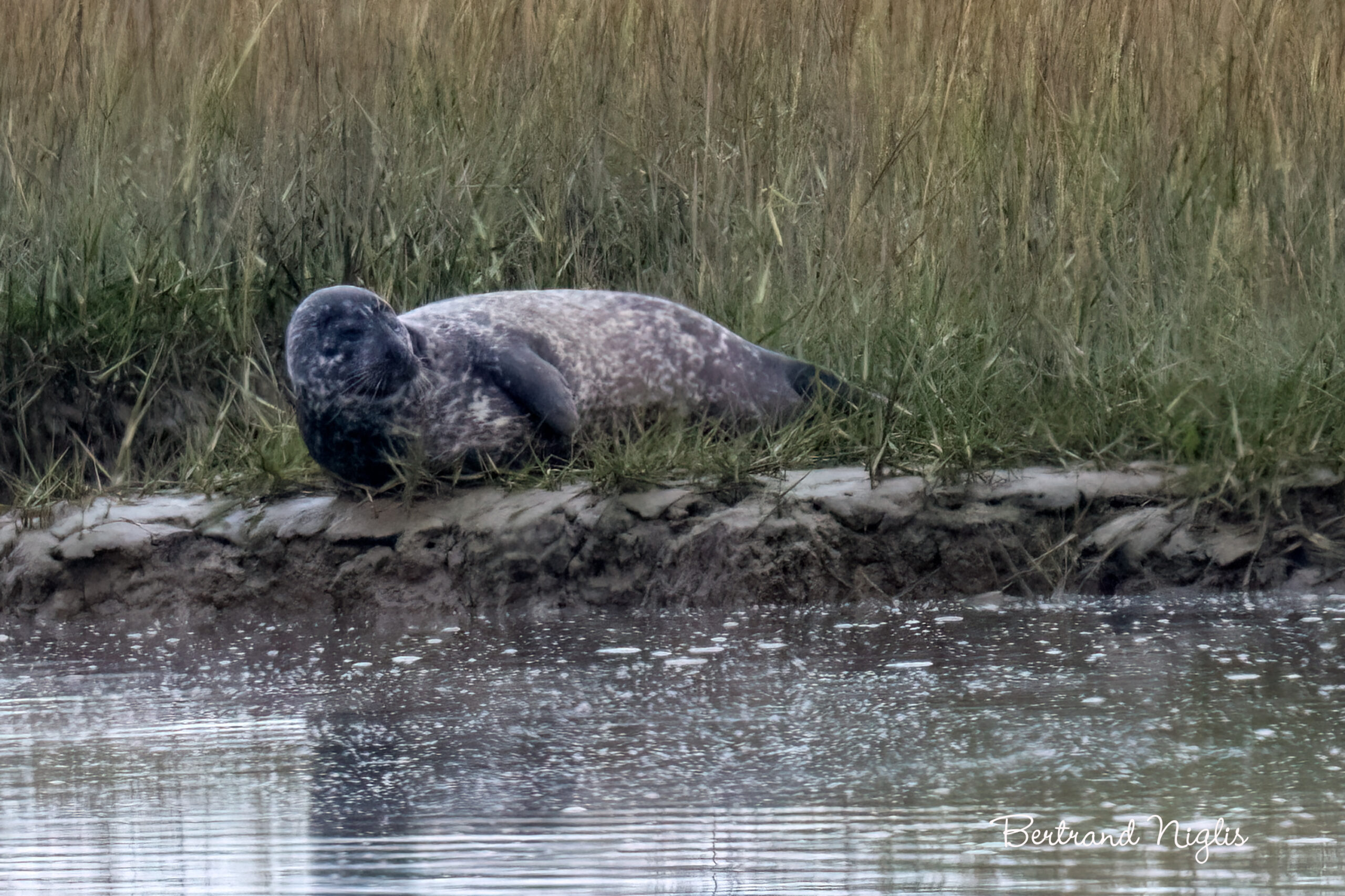 En ce dimanche matin, la saison de chasse en est à sa deuxième semaine. Plusieurs leurres sont disposés à l’entrée du marais et de temps en temps, on entend des détonations. Cela ne semble pas perturber le phoque qui se prélasse sur un banc de sable. C’est un Phoque veau-marin (Phoca vitulina), également appelé phoque commun, l’espèce la plus répandue et l’une des plus tolérantes à la présence humaine. Il est facilement identifiable par sa tête arrondie, son museau court qui rappelle une « tête de chien » et ses narines qui se rejoignent pour former un « V ». Plus petit que son cousin le phoque gris, il mesure entre 1,40 m et 1,90 m et porte un pelage tacheté, dont la couleur varie du gris clair au brun foncé. Son biotope de prédilection se trouve dans les eaux côtières, les baies abritées et les estuaires, où il peut profiter de bancs de sable découverts à marée basse pour se reposer. Le Phoque veau-marin est avant tout un carnivore piscivore qui se nourrit d’une grande variété de poissons (harengs, plies) et de céphalopodes. Bien qu’il se rassemble en groupes pour se reposer sur les échoueries, il est considéré comme plutôt solitaire lorsqu’il chasse. Il utilise ses vibrisses très sensibles pour détecter ses proies, même dans les eaux troubles. Contrairement au phoque gris, il est très sédentaire et ses petits, capables de nager dès la naissance, ne sont pas tributaires d’un long séjour à terre.
